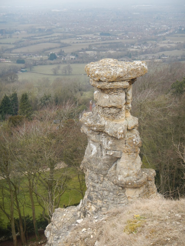 I passed a “headland” crowned with a prominent hill fort, meeting a dog walker (dog safely on a lead). There was a well signed path diversion and I passed the impressive limestone rock formation “Devil’s Chimney” above a disused limestone quarry near Leckhampton. There were further good views in this area.