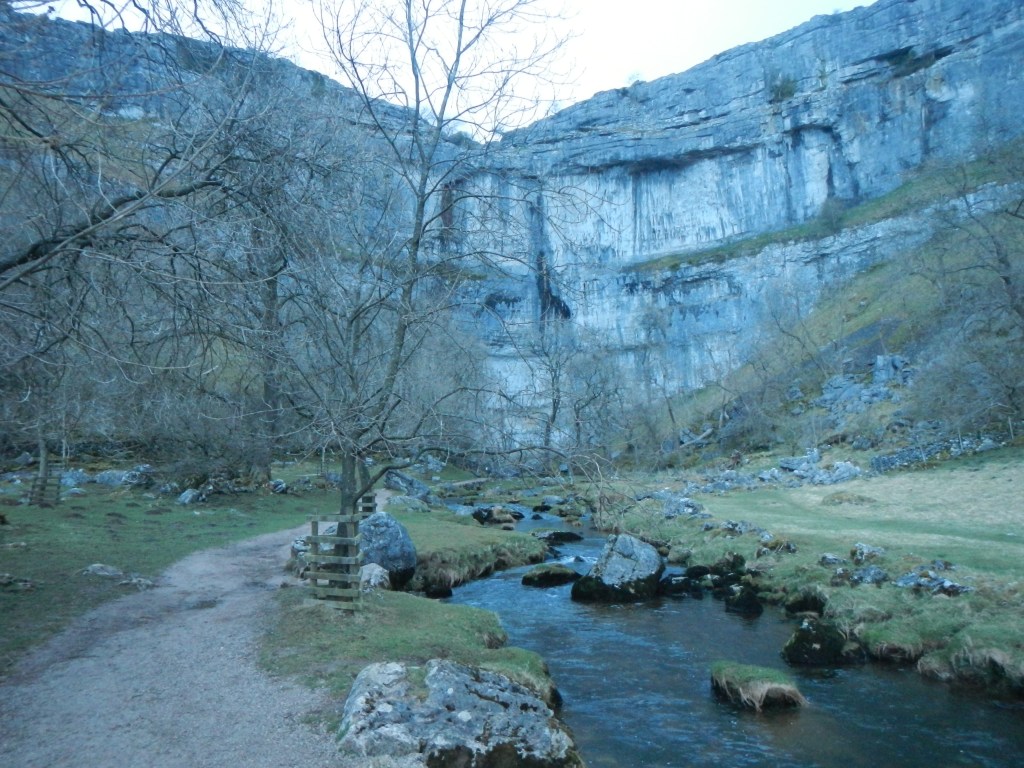 Dawn was just about breaking. It was a bit damp but by the time I reached the far end of Malham it was definitely raining, so on with the waterproofs. I spotted the campsite and saw Liz’s mother’s camper van – so that was where they were staying. I made a slight detour to get a good view of Malham Cove and then took the steep path up on to the limestone pavement. Unfortunately limestone plus rain is a recipe for slippery rocks so rather than admiring the impressive limestone pavement I was concentrating on avoiding any slips.
