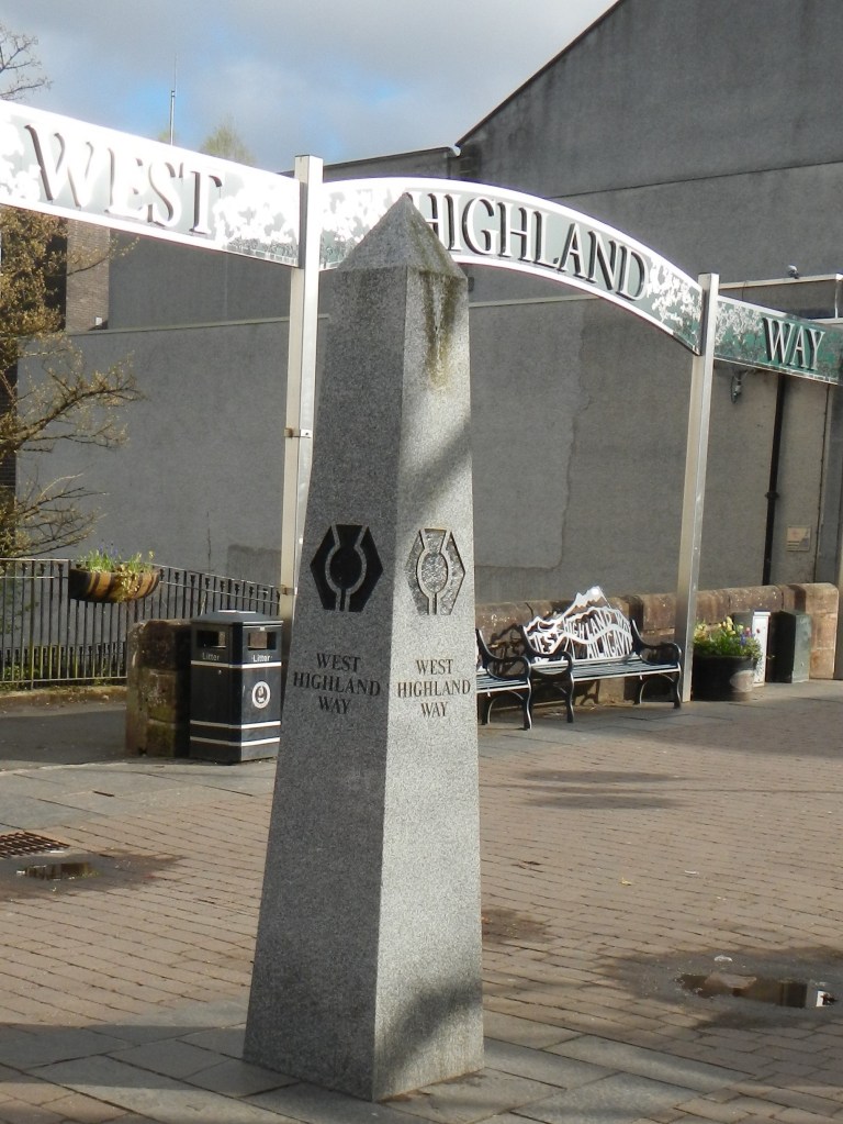 Given that Milngavie is the start point for the West Highland Way, I had expected there to be an outdoor shop so I could buy stove fuel. My husband could not bring that for me as he was flying. Eventually after asking at the Tourist Information Office, I discovered a hardware shop which had a small supply of the sort of gas canister that I needed. The start point for the West Highland Way was marked prominently. I bought some postcards from the bookshop.