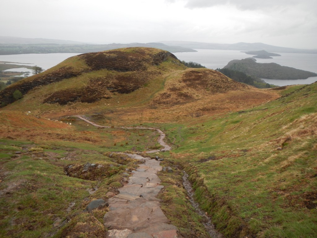 Eventually I turned off through the forest. I opted for the more difficult walk near the end over the Conic Hill – this was open as evidently calving and lambing had finished for the year. It was a steep path and the weather was windy as well as wet. The stunning views over Loch Lomond were partially obscured by the rain. I took care on the slippery and steep downward path and was amazed to see a cyclist carrying his bicycle up the hill.