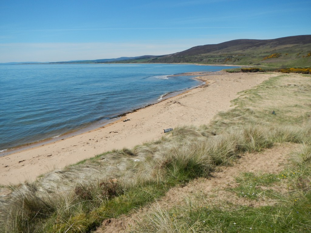 I wasn’t keen on the A9 and hoped that the path by the foreshore would continue so I could follow it. The coastal scenery was awesome – golden sand, clean looking pebbles, dune cliffs and all below a cloud free blue sky. I walked on a mixture of foreshore and bordering fields. In places there were rabbit burrows and so many rabbits that I was concerned about stepping on one. I saw lots of oyster catchers and Arctic terns. Sadly there soon wasn’t a path and I was scrambling over rocks as well as crossing barbed wire fences. This was difficult with my heavy backpack. I even had a couple of spells when I trespassed on to the railway line chippings where I maintained a high level of alertness listening out for trains.