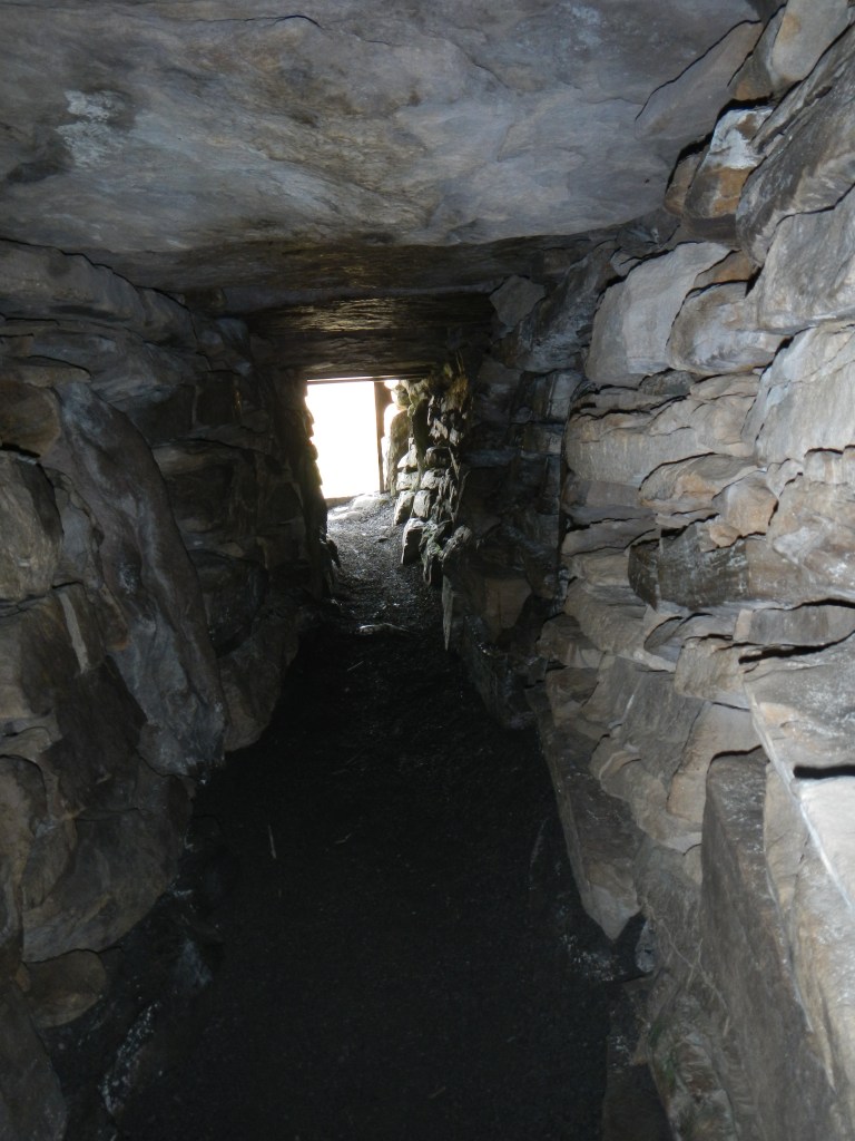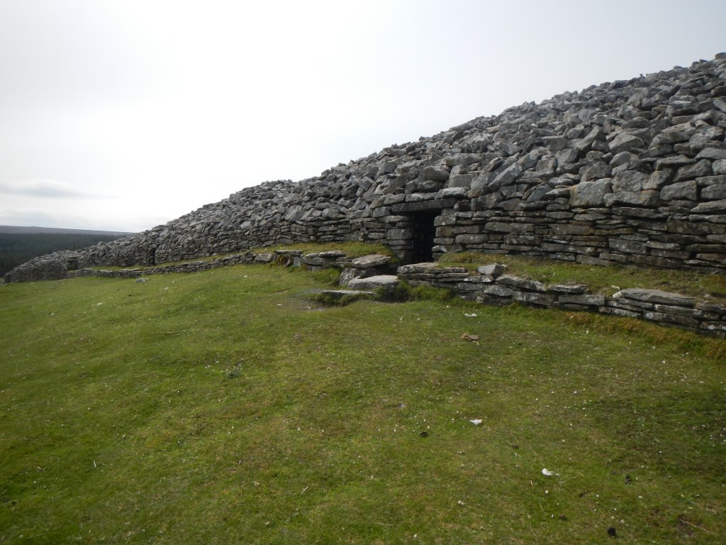 At about 14:30 I was pleased to arrive at the Cairns of Camster. These are very significant Neolithic chambered burial cairns dating back 5,000 years. I crawled into one of them. They are just big piles of stone from the outside with no overlying turf. I learnt that, from the cairns, there are no views either of mountains or of sea.