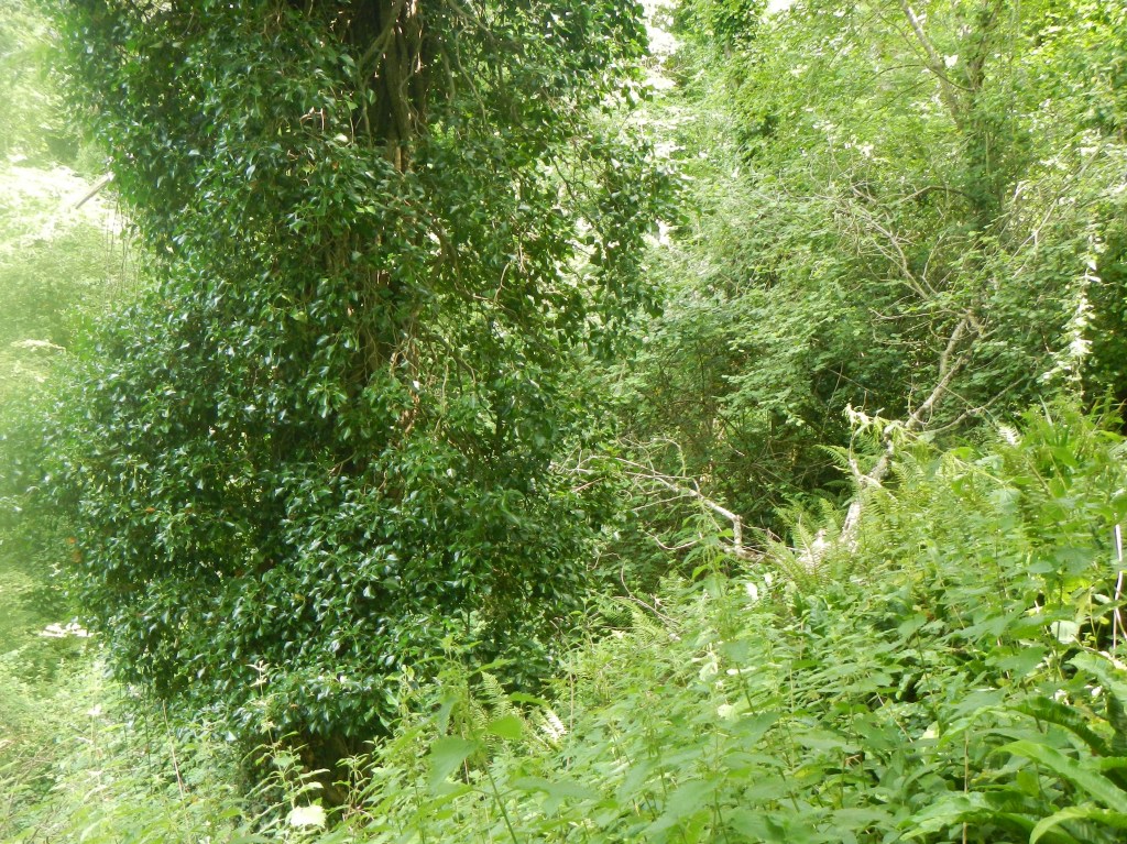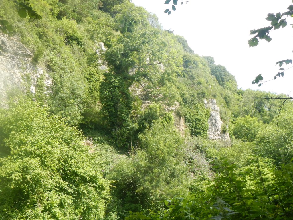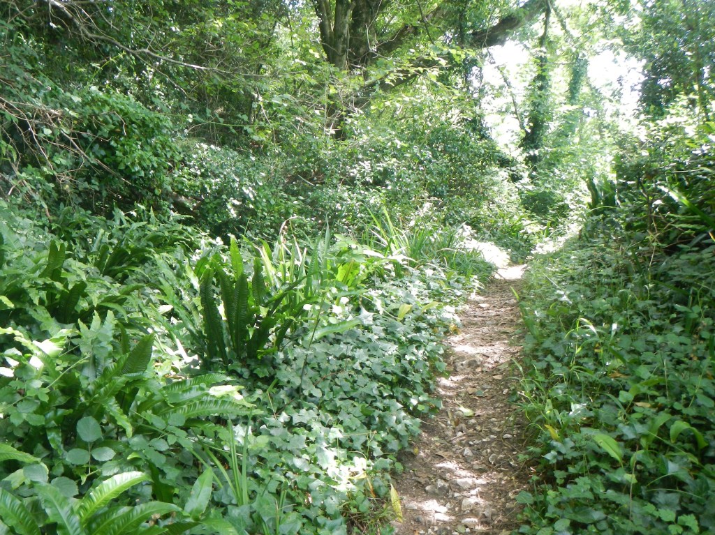 Most of the rest of the path passes through a spectacular wilderness. Landslips create open ground which becomes colonised by grassland and scrub before becoming a natural woodland. The path is very clear and there is no need for a map except to judge how far you have walked along the route. The vegetation off the path is mainly very thick, the dense undergrowth hiding sheer drops, mudflows and deep fissures. Off the path there is the constant threat of rock fall from unstable cliff edges. Foliage in all shades of green predominates. There are multiple uprooted trees, the result of landslips. The silence is broken only by bird song, rustling of leaves in the wind and the occasional walker or runner passing along the path. Shafts of sunlight pass through the tree canopy and occasionally there is a also a break in the trees with a glimpse of the sea. Towards the land side, huge towering cliffs and pinnacles are sometimes visible. At times the pungent scent of wild garlic is wafted on the air.