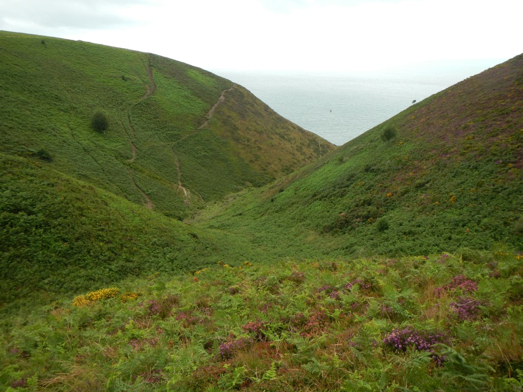My first target was Selworthy Beacon. By the time I climbed there, the visibility was already improving and the view stretched far over Exmoor. I descended on the official coast path to the west end of the rugged path. The path is well defined and although exposed in places it is certainly not precipitous and is easy to walk. There was plenty to see with a profusion of plants including purple heather and foxgloves, some yellow gorse starting to flower, red berries on rowan trees and lots of green grass and bracken. As I walked on round the coast line down into combes and back up again I had excellent views across the Bristol Channel to the coast of South Wales. Ahead of me I could see the distinctive outlines of Flat Holm and Steep Holm (I can vouch for the trip to Steep Holm – an amazing day out, travelling by rib boat). I could hear the constant white noise of the waves on the shore below the steep cliffs, the intermittent song of birds and the rustle of wind on the vegetation. I could smell the distinctive scent of the bracken, a reminder that this is moorland at the coast. I could feel the gentle breeze in my hair. I was even able to pick a few bilberries, savouring their distinctive sharpness in my mouth. It was indeed an experience to be treasured involving all five senses.