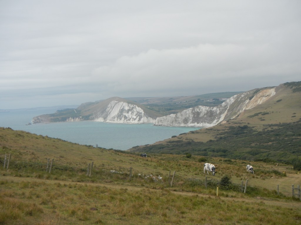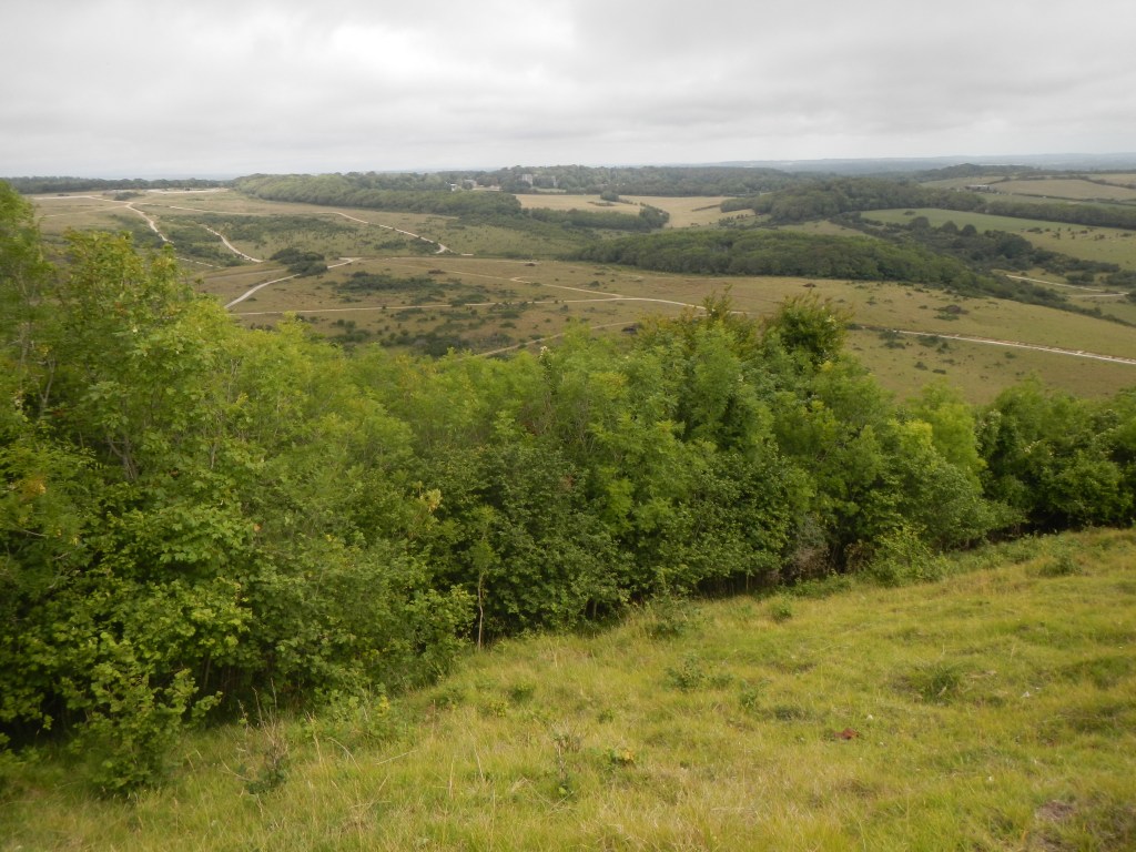 The fact that this is an army range used for live firing much of the time, means that even when access is allowed it is restricted to a small number of paths which are all clearly marked with yellow posts. However apart from the occasional “targets” and the views of the large Lulworth Camp barracks, the scenery is largely unspoilt. Cattle and sheep were grazing – hopefully they are moved away during “exercises”. Ironically the army presence means that wild flowers can thrive, there were a variety of butterflies to see and some pockets of ancient woodland, including ash, beech and oak trees as well as hawthorn, blackberry brambles and sloe bushes. I am sure that I remember reading that had the Army not taken over the land in 1943 then modern farming methods would have altered things and features of historical interest such as remnants of strip farmed areas would have been lost.