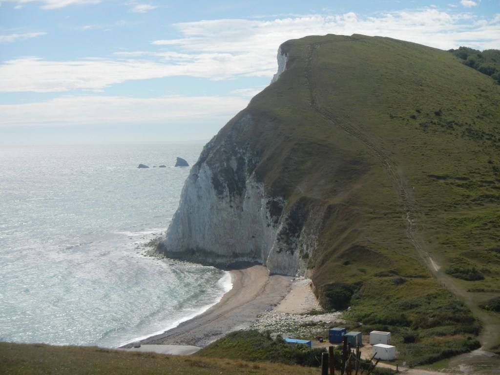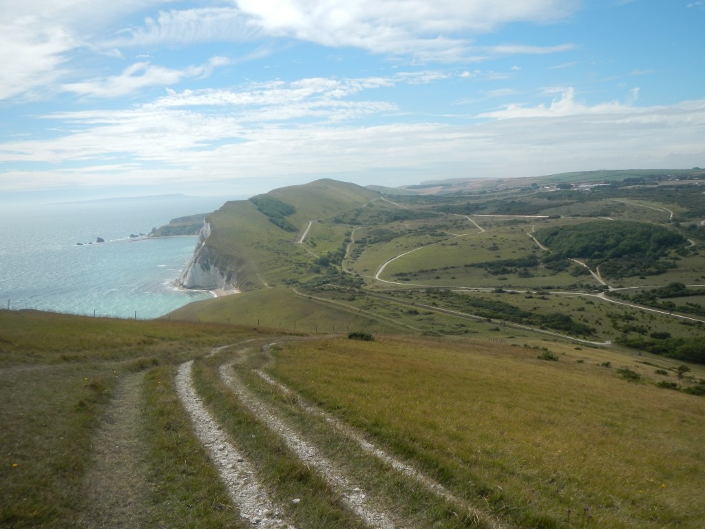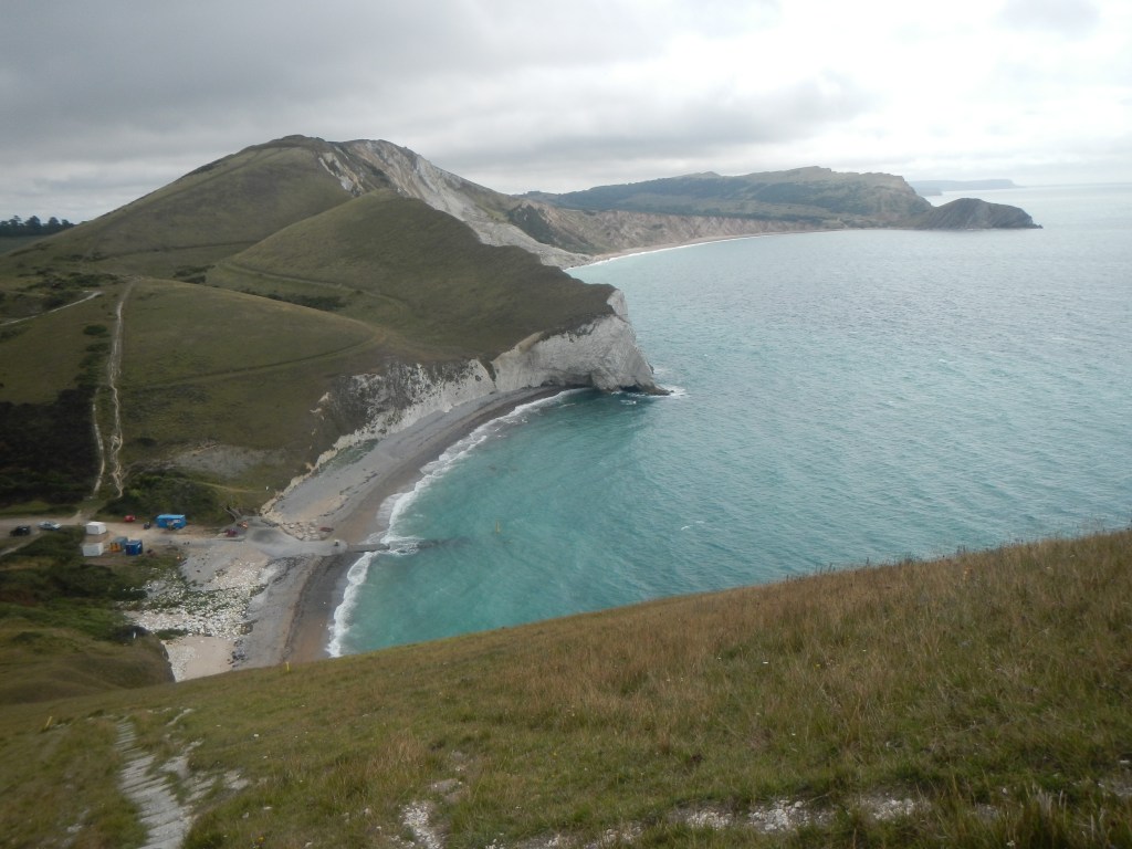 This is a real roller coaster of a path and, unsurprisingly, is classified as “severe” (the most strenuous category) by the South West Coast Path Association. Hence from Flower’s Barrow the route descended again almost to sea level at Worbarrow Bay. Suddenly there were more people. owing to a level walk from a car park a mile distant. However they were mainly making for the beach. I decided to take a short diversion (with another steep uphill) on to the otherwise deserted Worbarrow Tout, where there was a further impressive view point.