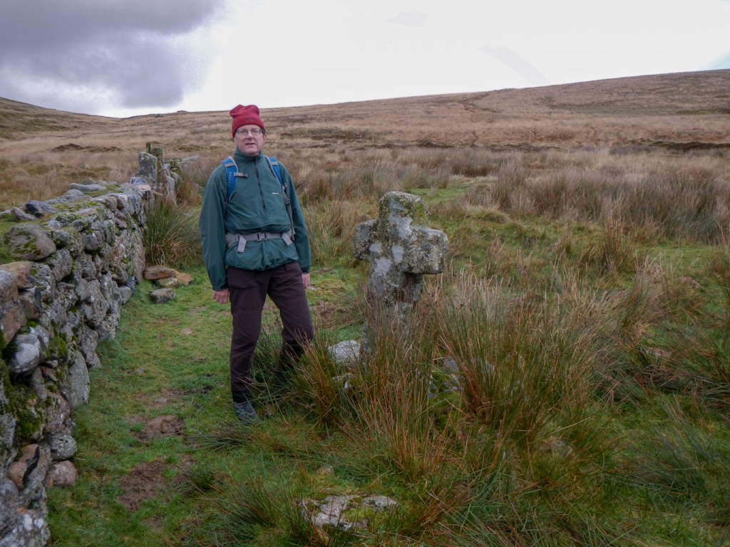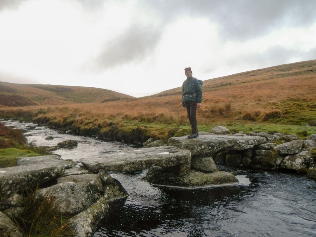 From the turning, there was a marked uphill (passing some ponies) to reach the top of the dam. My husband set off as soon as he saw me and says he had waited forty minutes – I’m surprised it was that long and think he exaggerated. We saw some circles on the hillside (ancient settlements) and soon we were crossing some boggy ground then over the new small clapper bridge at Western Wella Brook foot to arrive at the Huntingdon Cross. This was one of the boundary posts marking the parish of Brent. There’s a ford across the Avon here (not sure it would be very safe on foot today but I have walked across once in the summer) but we were keeping on the same side of the river and crossing at the clapper bridge just under a kilometre further up river.