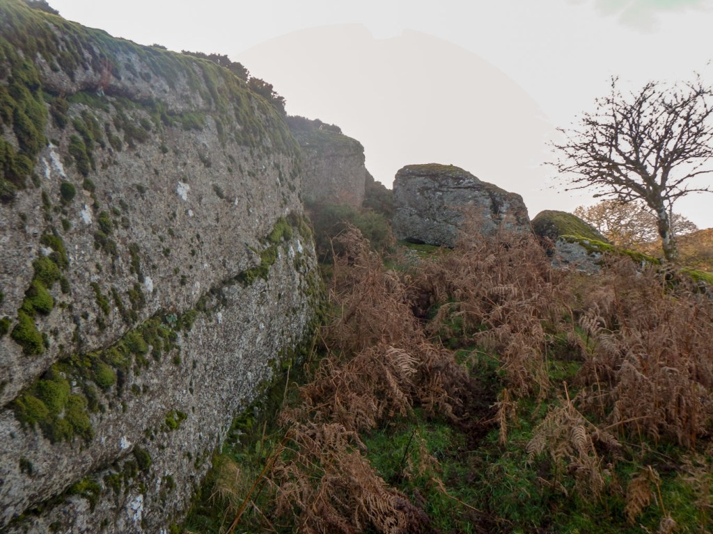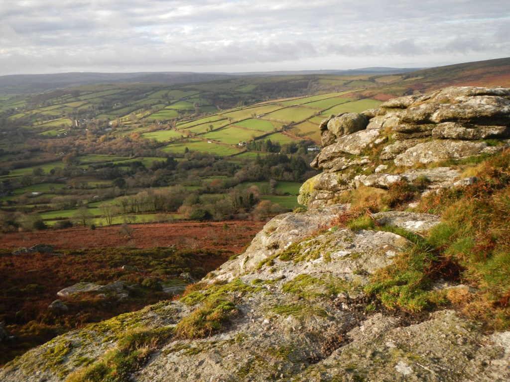 My route, now in a generally southerly direction, continued along the ridge of the Downs and I passed several ancient barrows. I had excellent views particularly to Bonehill Down that I had visited earlier but also further east towards the Haytor area. My next challenge was to visit five tors that aren’t marked on the Ordnance Survey map but are included in the LDWA list. Needless to say, this involved lots of tussocky hummocks, rocky areas and high gorse bushes as they were all off paths to a greater or lesser extent. With the help of having points plotted on my Satmap, I found them all. Wooder Gayle Rocks, perched high above a stream in a small ravine is particularly noteworthy.