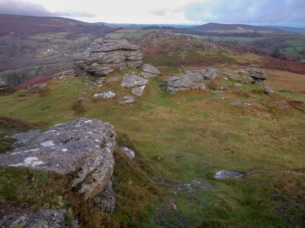 It wasn’t far to walk up a narrow lane to reach an access point to Hamel Down. I climbed up an initial grassy track passing a memorial to airmen from World War 2 whose aircraft had crashed and they had been killed on the moor. Soon I was heading north (now on Hookney Down) over tussocks towards King Tor. The round cairn is much more prominent than the tor when approaching from the south so it was helpful to see the cairn as I approached.