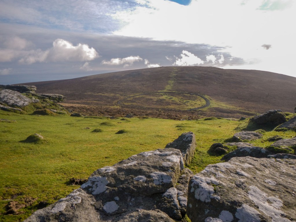 I almost gave up on Shapley Tor when I saw that the path was occupied by a large herd of Highland cattle but I decided to walk around them with a large berth. What I didn’t realise was that I went round in the direction the herd was moving – they were still a long way from me but I was worried that these huge animals were moving towards me. At least that meant that I could easily return back down on the path this time to ascend the next hill and reach Hookney Tor. From Hookney Tor, the most impressive sight is of Grimspound. This prehistoric settlement probably dates from the Late Bronze Age (about 1450–700 BC). There is a huge area enclosed by a stone wall. Apparently the remains of 24 houses are enclosed within the wall, and there are further house traces outside the enclosure. Amazingly the whole area is entirely open on the moor and in fact my route to Hameldown Tor went right through the middle of it. I saw some other walkers, passing them as I headed to Hameldown Tor. Before that I seemed to have the moor to myself.