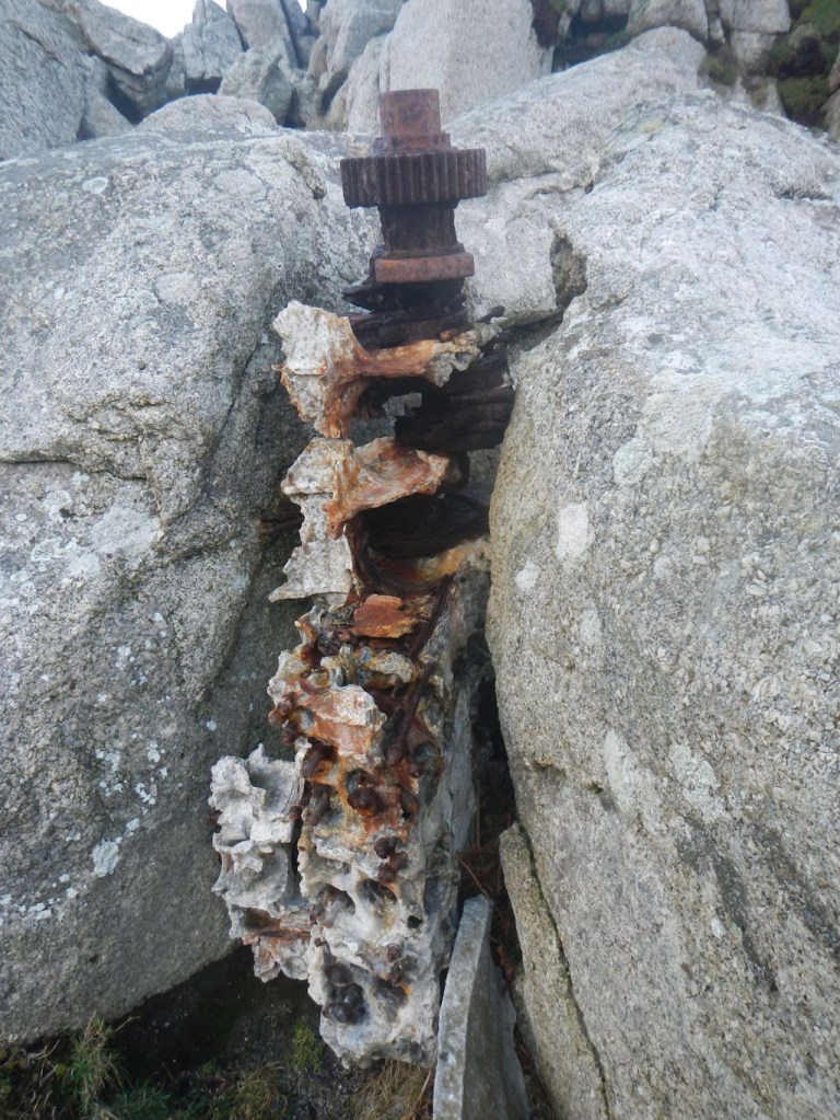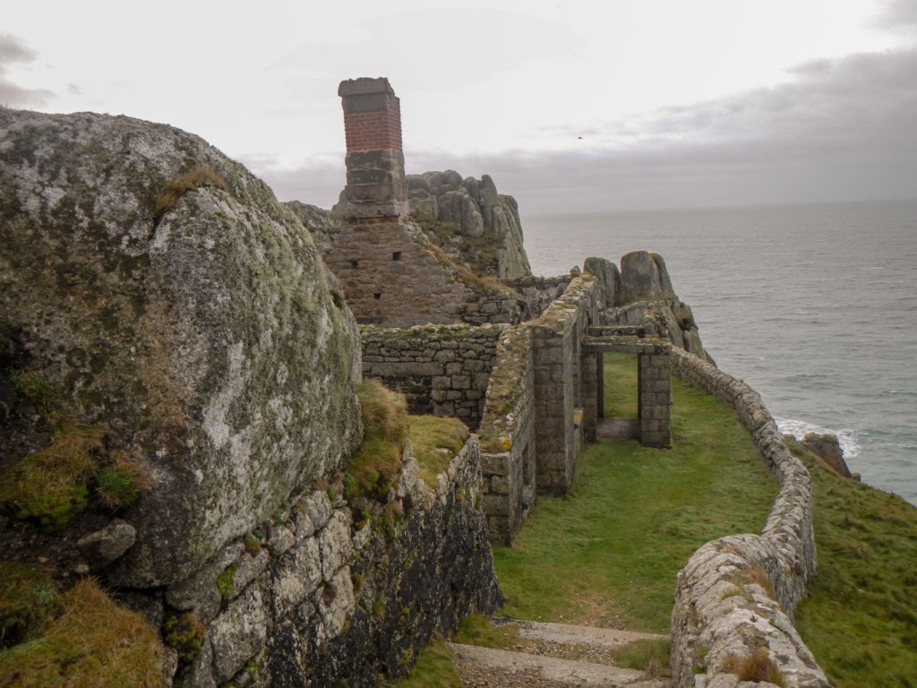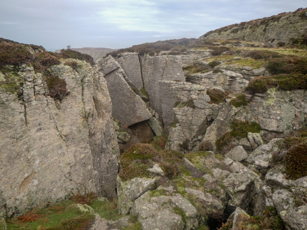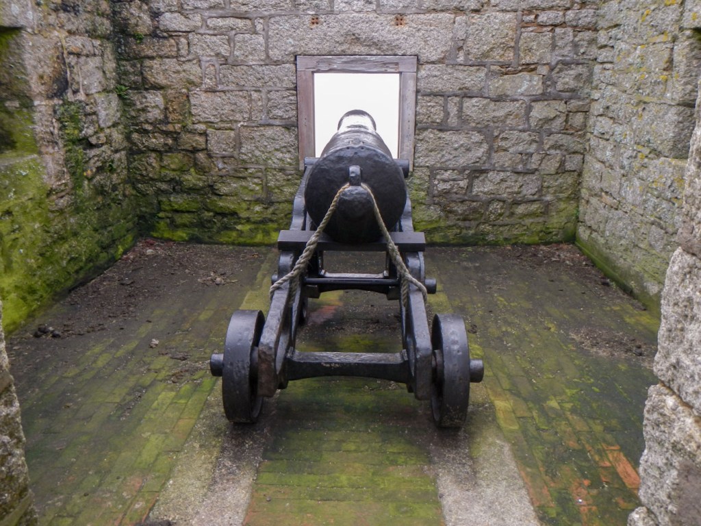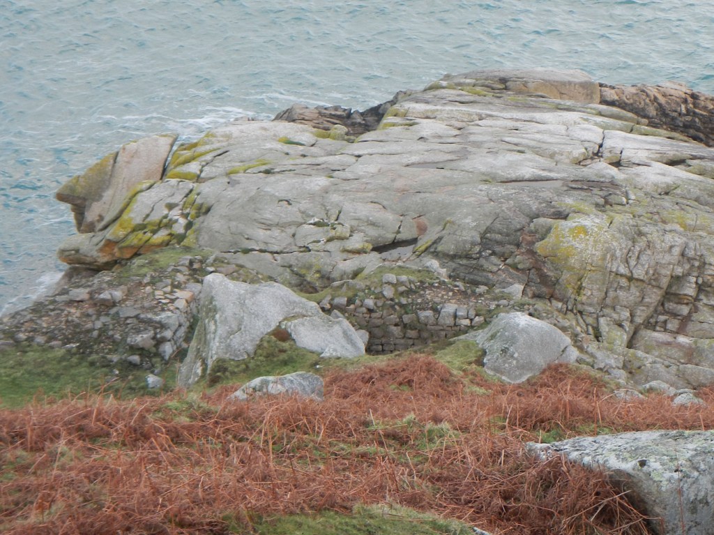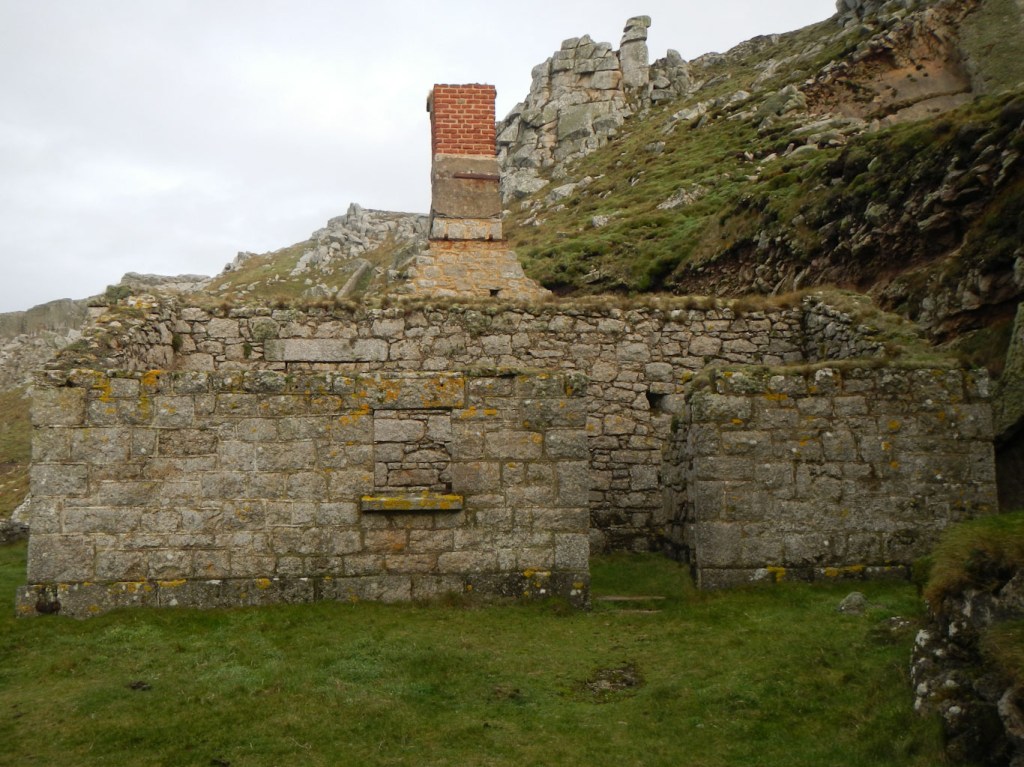 Apart from finding letter boxes, there are lots of other things to explore and see on the island. Some of these are associated with the letter boxes. Hence I found the way down to “The Battery” below the rocky Battery Point where I was unable to find the letter box. The fog battery is actually a rare survival with most of its components still visible. Together these give a clear impression of how the fog battery operated, as well as illustrating the relations between domestic accommodation and the work place in a marginal coastal environment in the late-19th century. The most impressive bits are two 18-pound cannon on a sloping floor of brick. The wheels of the guns are set in grooved granite setts and the recoil of the discharge was absorbed by the slope of the floor. The guns are of iron and bear the royal cypher GR showing that they belong to the reign of George I. They were therefore obsolete when the battery was constructed.