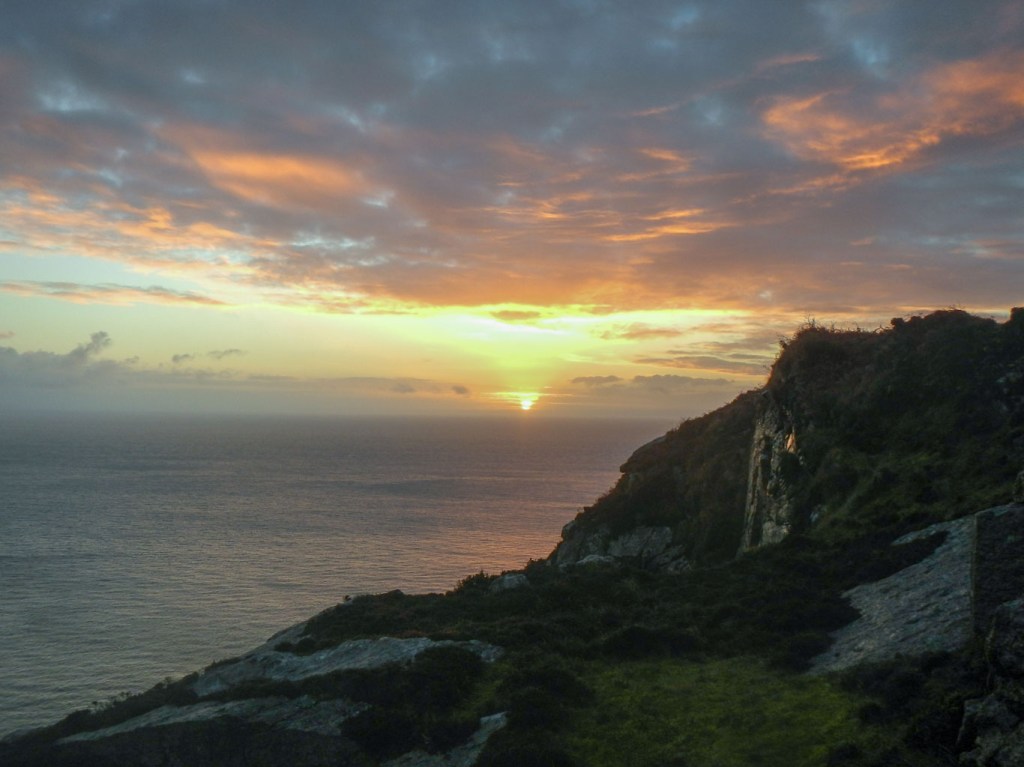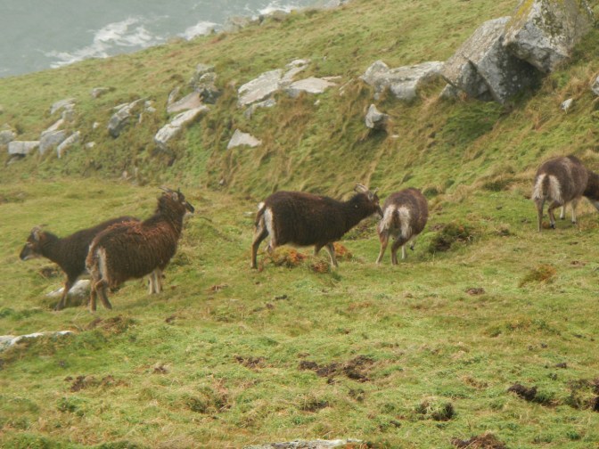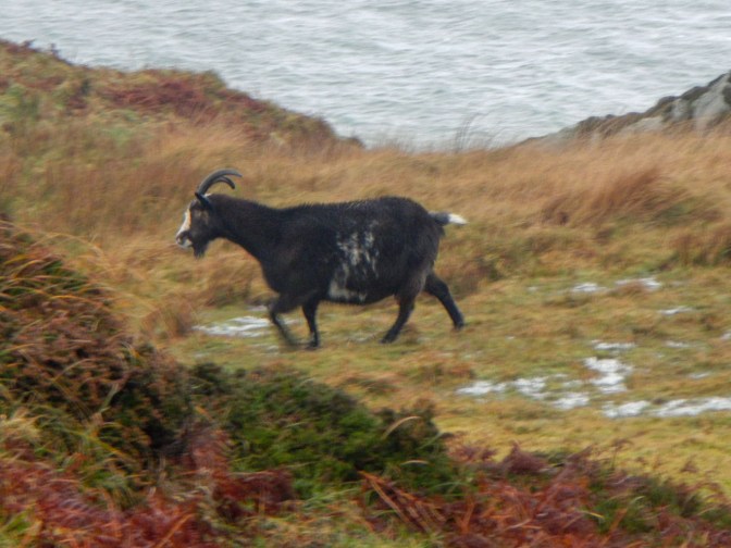 The most northerly “quarter” is the longest and most remote section. As I approached it, I saw a magnificent rainbow and then, from the slightly higher ground I was on, the land ahead of me was bathed in sunlight. I saw a few Soay sheep and a small group of feral goats, before reaching the northern end and the aptly named ruin of John O’Groat’s House where I sheltered from the wind to eat lunch. John O’Groat’s House is thought to be the remains of a post-medieval watch house, possibly associated with a gun battery. Recent survey work has suggested that it was built on the remains of a bronze-age cairn. After lunch, I descended the steep steps towards the North Light before heading back to the village along the windy west coast.
