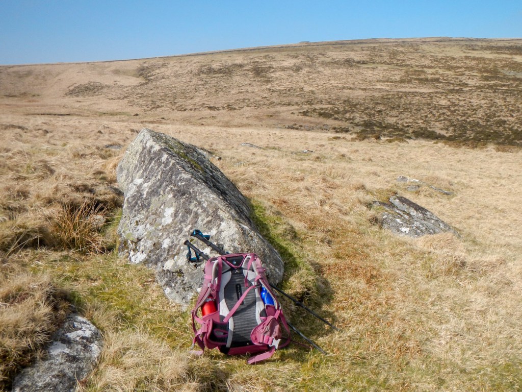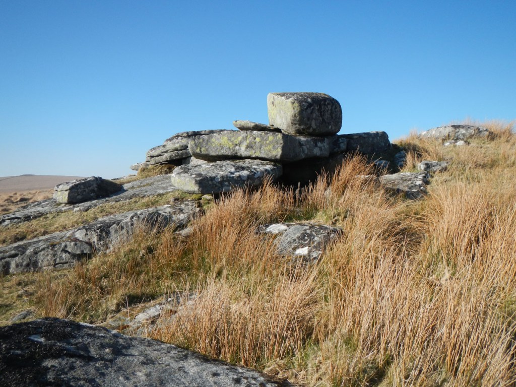 Sittaford Tor is prominent and I found this stunning viewpoint easily, surprising a fox crossing the path “en route”. After the obligatory tor photo I headed down past the ruins of Teignhead Farm. I spotted a prominent cairn in the distance and headed for it – unfortunately it wasn’t Manga Rock which was where I wanted to be. I backtracked and descended to Manga Rock, stopping for lunch there. I thought that Watern Tor might be relatively crowded so best to have an early lunch.