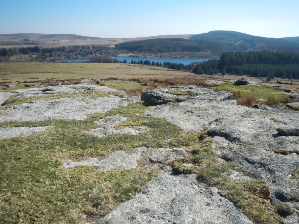 I didn’t follow the shores of the reservoir for long as I turned along a gravel forest track. I passed a clearing with a stone row and circle. I turned down another made-up gravel track to pass Hemstone Rocks. from the map, it appeared that the rocks would be in a clearing adjacent to the path. Unfortunately I didn’t find the clearing or the rocks. However there was a stile at the end of the track so it was easy to leave the forest. I am beginning to think that I will confine my tor bagging to the big rocky outcrops and leave out all the ones that are difficult to find – they are nearly always a bit disappointing even when I do find them!