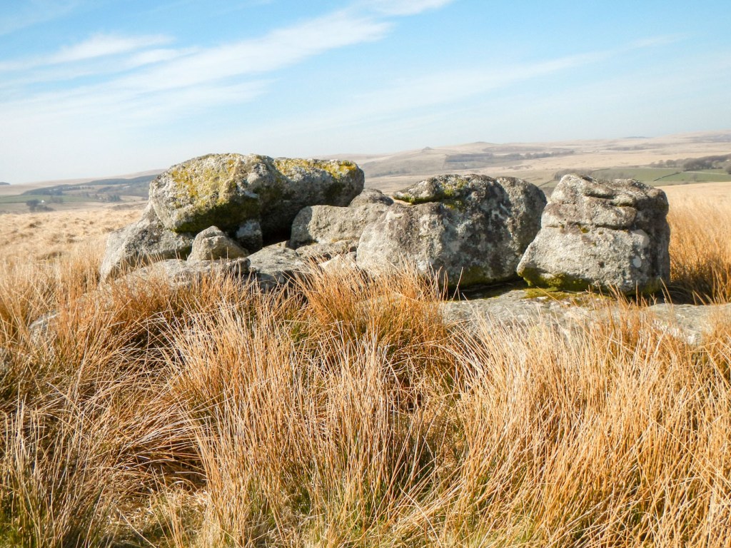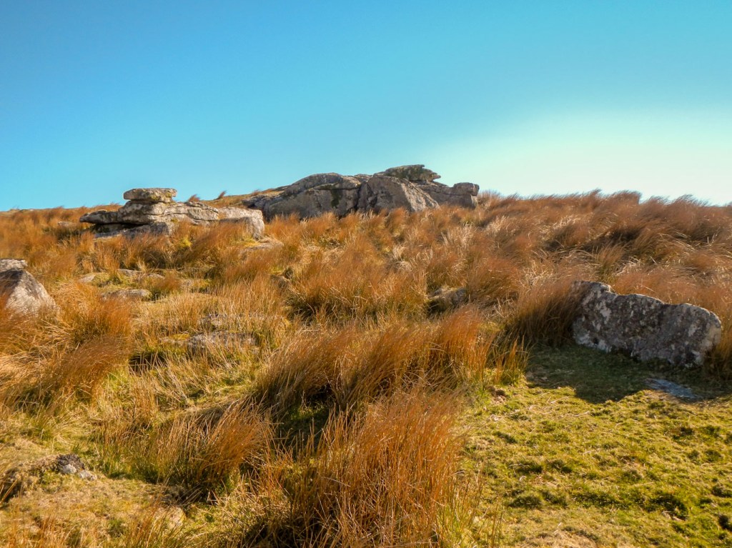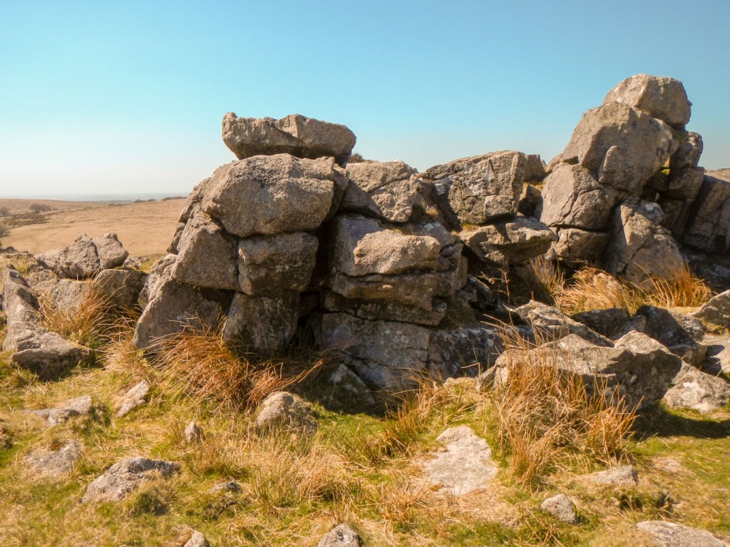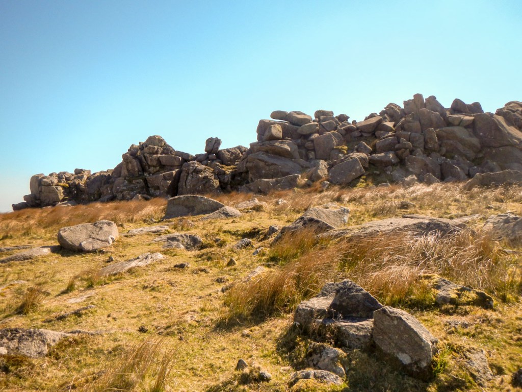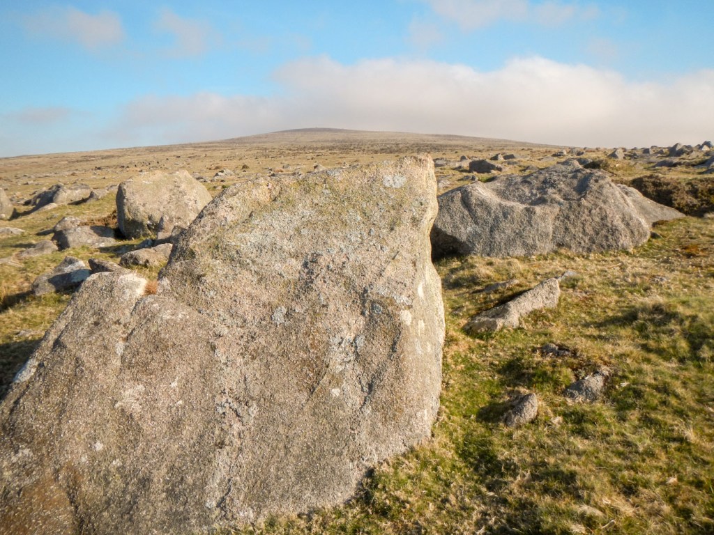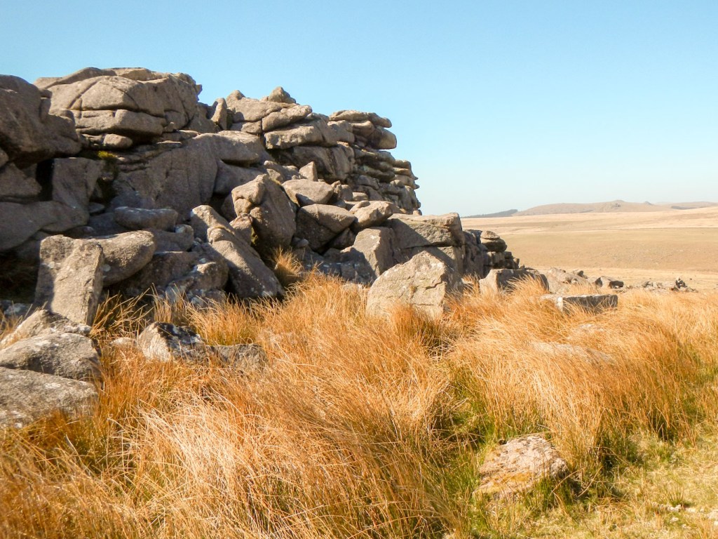 There was further easy walking to Penn Beacon and the second trig point of the day. Next I descended to Rook Tor. As mentioned in Tors of Dartmoor Database Result: Rook Tor this is little more than piles of clitter with a scattering of larger rocks.