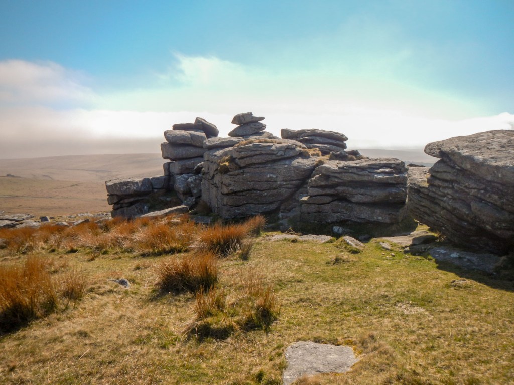I was on Trowlesworthy Warren. To reach the two tors, I had to cross a deep ditch. There were a few narrow stones forming “footbridges”. With my heavy rucksack and in the wind, I was concerned about overbalancing. The ditch was too wide to step across. Eventually I found a slightly wider bridge and was across. Both the Little and the Great Trowlesworthy Tors are impressively large. There were a couple of walkers there but by the time I arrived they had left in a different direction.