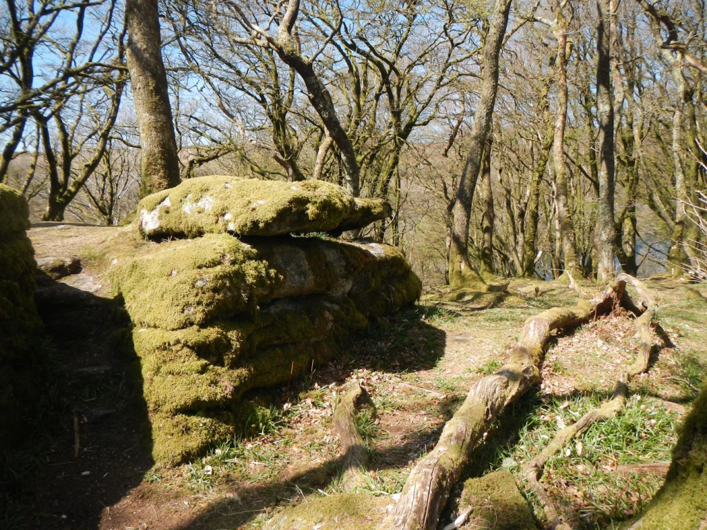 There was a pleasant well defined footpath which later merged with the cycle path from Princetown on the disused railway. I could see the Burrator reservoir below. I descended to the reservoir at the dam. Burra Tor was just beyond the stile at the far eastern end of the dam. Unlike a lot of the woodland tors, it is obvious and huge. There was unexpectedly a footpath through the wood and it seemed to go the right way so that I descended to the road just before arriving at the sign for Sheepstor village.