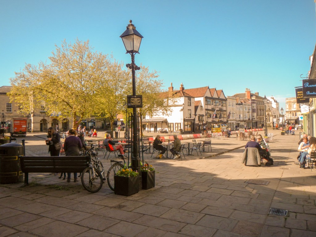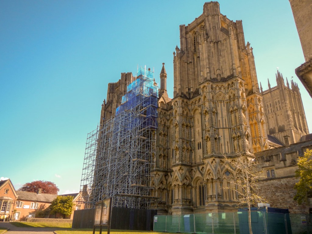 On studying the claims of cities to be the smallest in England, Wells is the smallest free standing city with an area of 2.11 square miles. The City of London has a smaller area but is of course part of a much larger urban area. Hence it’s not particularly surprising that one moment I was walking through the bustling market place where the multiple cafes were serving socially distanced customers on outside tables and then, in a matter of a few hundred metres, I had passed the impressive but scaffolding cloaked west front of the Medieval Cathedral, the enormously wide moat surrounding the Bishop’s Palace and was surrounded by tranquil meadow scenes.