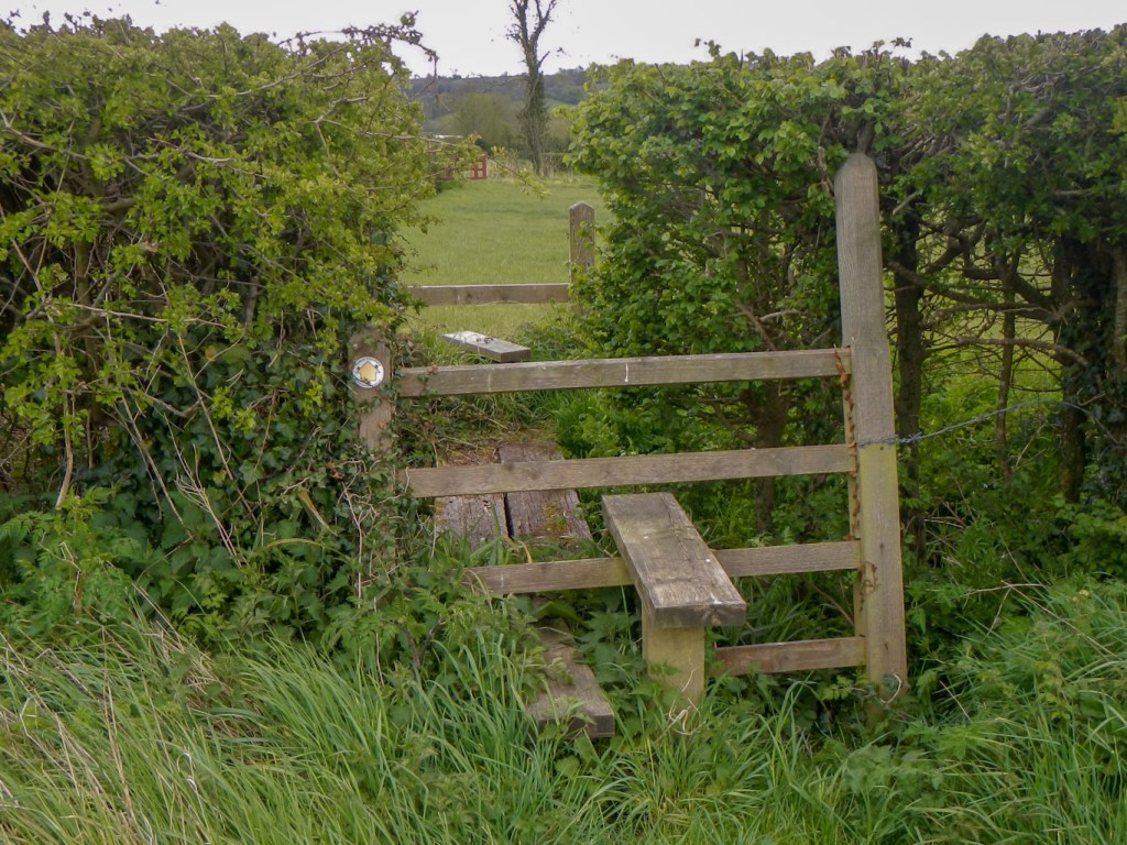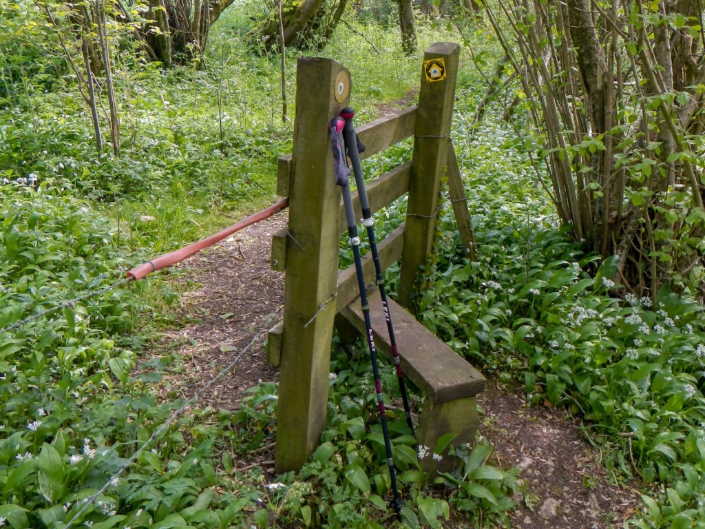I crossed the busy A371 on a footbridge and then a further bridge over the River Sheppey. I already had glimpses of the distinctive outline of Glastonbury Tor, at this distance looking like a steamed pudding topped with a candle. Soon I had my first significant climb of the day over Worminster Down, encountering several stiles. I descended through more woodland, where there were further bluebells as well as the pungent aroma of wild garlic, towards North Wootton. I came across a hidden encampment of semi-permanent looking tents and yurts. This was the first sign I noticed of the “alternative” lifestyles for which this area is famed.