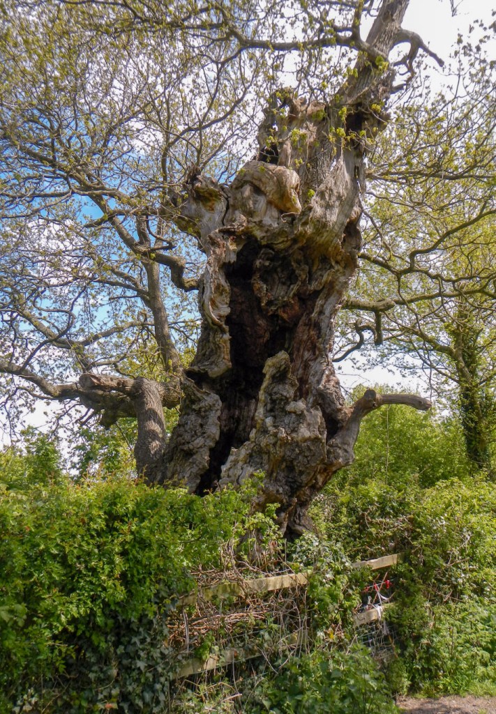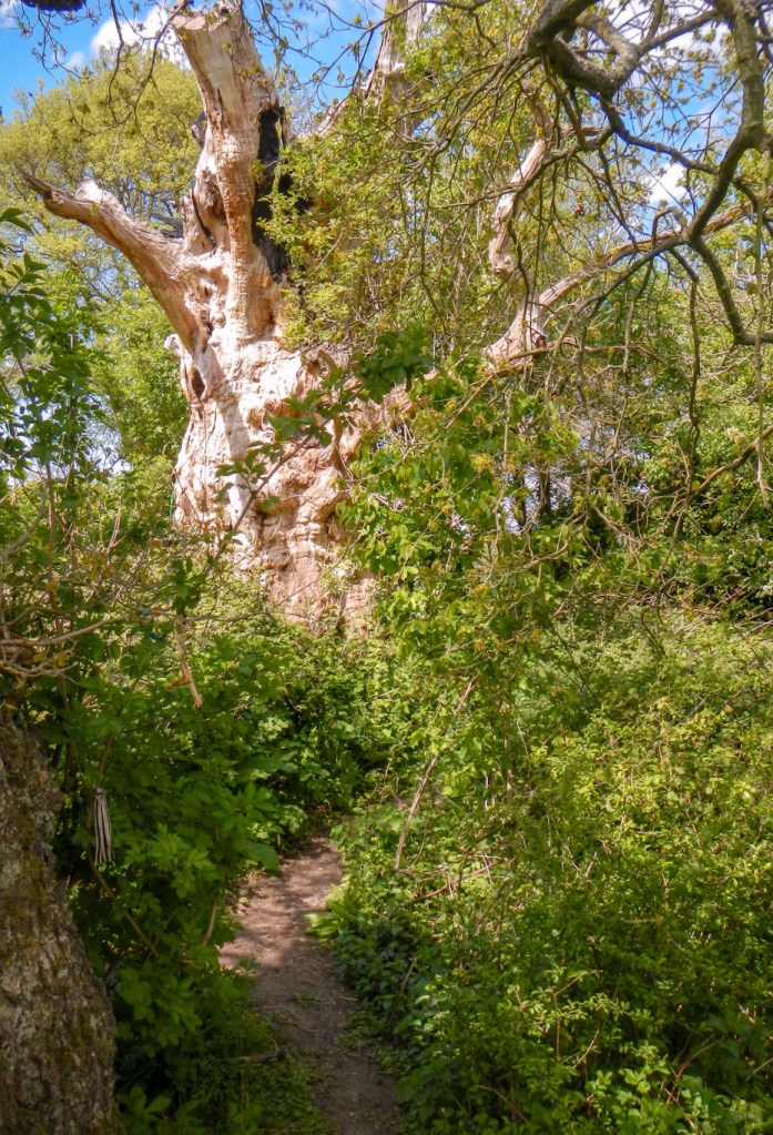 I consulted the map again to make a short diversion to the two remaining Oaks of Avalon, nicknamed Gog and Magog. In 2017, Gog was set alight by a candle and is now deceased, consisting of a dried out remnant. Magog is twisted and gnarled, surely with little life left. They are reputedly a thousand years old on ring count and the traditional entry point on to the Isle of Avalon. More symbols of alternative culture can be seen as there are bedraggled ribbons and decorations on some of their lower branches.
