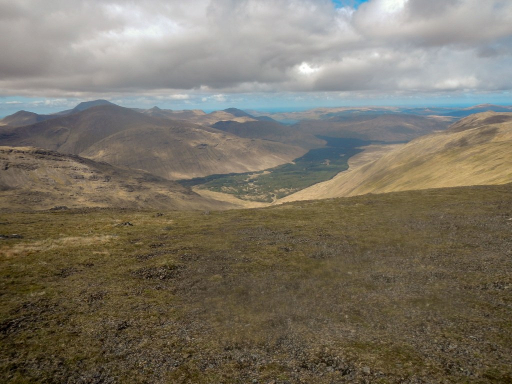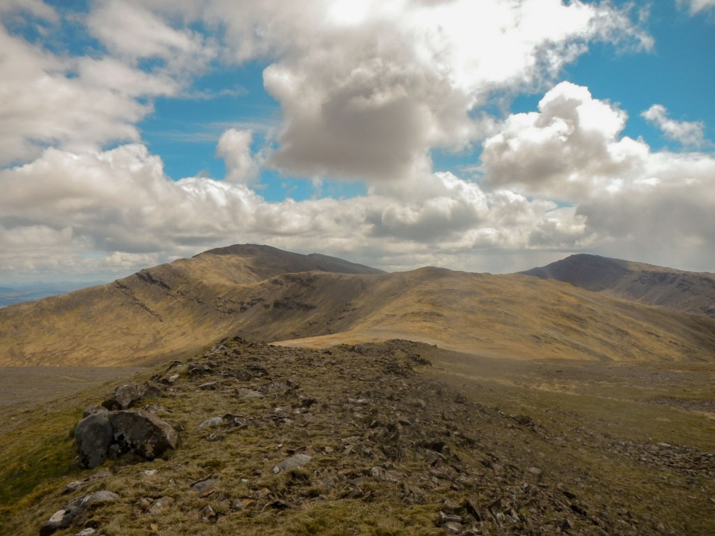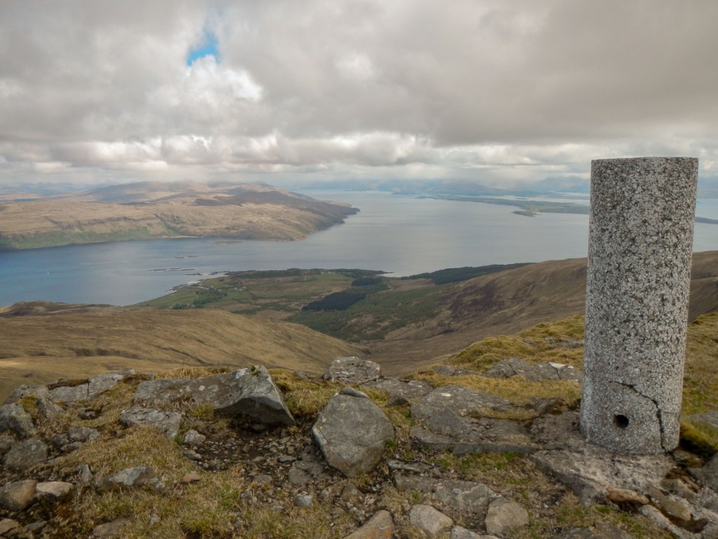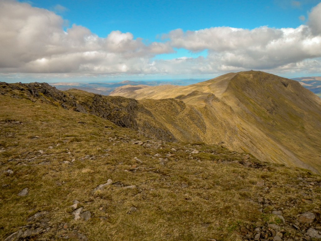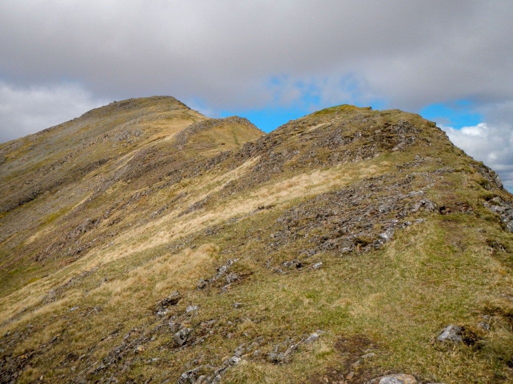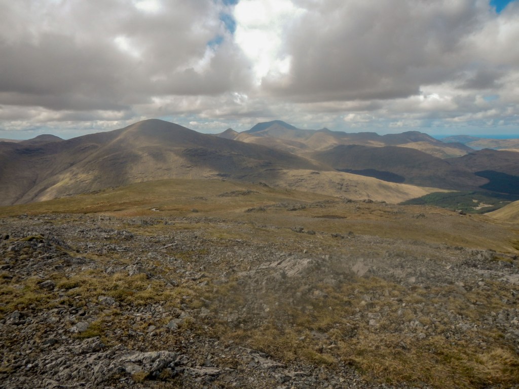 Once off the track, the path was intermittent. Soon I was walking along an exposed but wide ridge (so I had no particular worries about falling off!). I reached the trig point and huge cairn on Mainnir nam Fiadh.