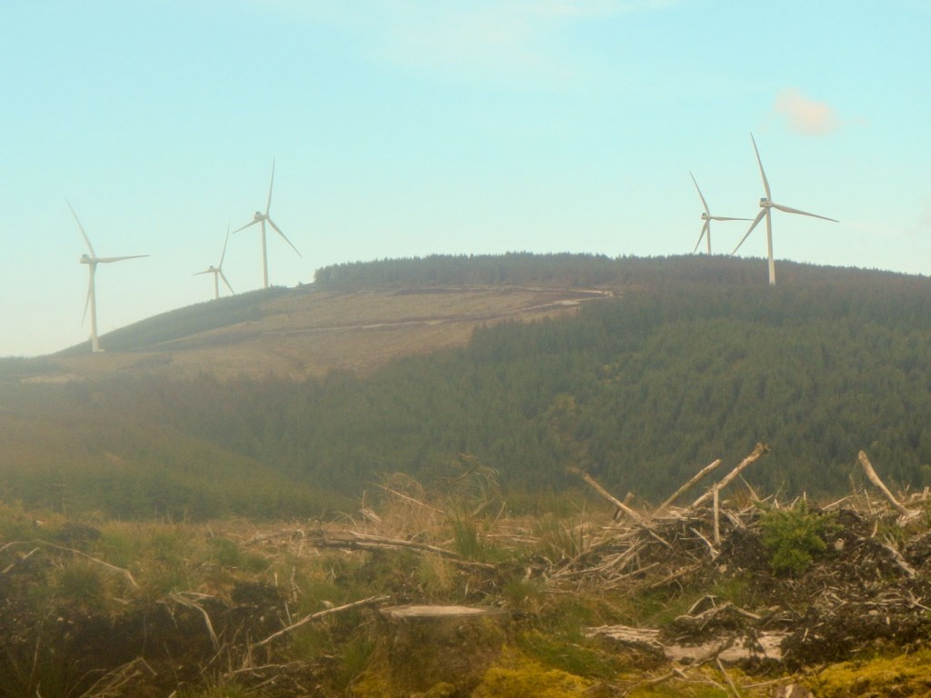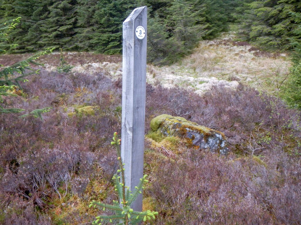 After lunch there was just a short stretch to walk back towards the main road which I crossed and I was immediately on a forest track. Despite the notices mentioning the need for map and compass across the desolate centre of the peninsula, I was on a well marked mainly gravel track throughout with plenty of waymarks. It was easy to make rapid progress on this terrain, even though there it was undulating and, initially, primarily uphill. I walked right through the Deucheran wind farm, where there are nine enormous wind turbines, some very close to the track. Warning notices explained the dangers, including of snow falling off the blades. Fortunately there was no sign of snow and the weather was warm, sunny but windy. I enjoyed clear views.