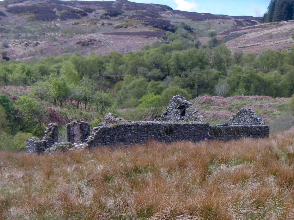 I discovered that not only were there waymark posts, but also mileposts. One side of the post stated how many miles I had done and the other side told me how many miles were left to do. The route went on to a gravel track through coniferous forest. There were huge log piles at intervals where the trees had been cleared. I had occasional glimpses of tranquil Loch Fyne through gaps between the trees. Later the route went on to a clear path and through deciduous woodland – I noted ash, birch, willow, hazel and occasional oak trees. The forest floor was carpeted in places with bluebells and primroses in full bloom. I spotted three deer on separate occasions but they all ran away rapidly at my approach. The later part of the route to Skipness followed a stream. There were some ruined stone dwelling places, no doubt evacuated during clearances. There were a few other walkers but generally it was all deserted.