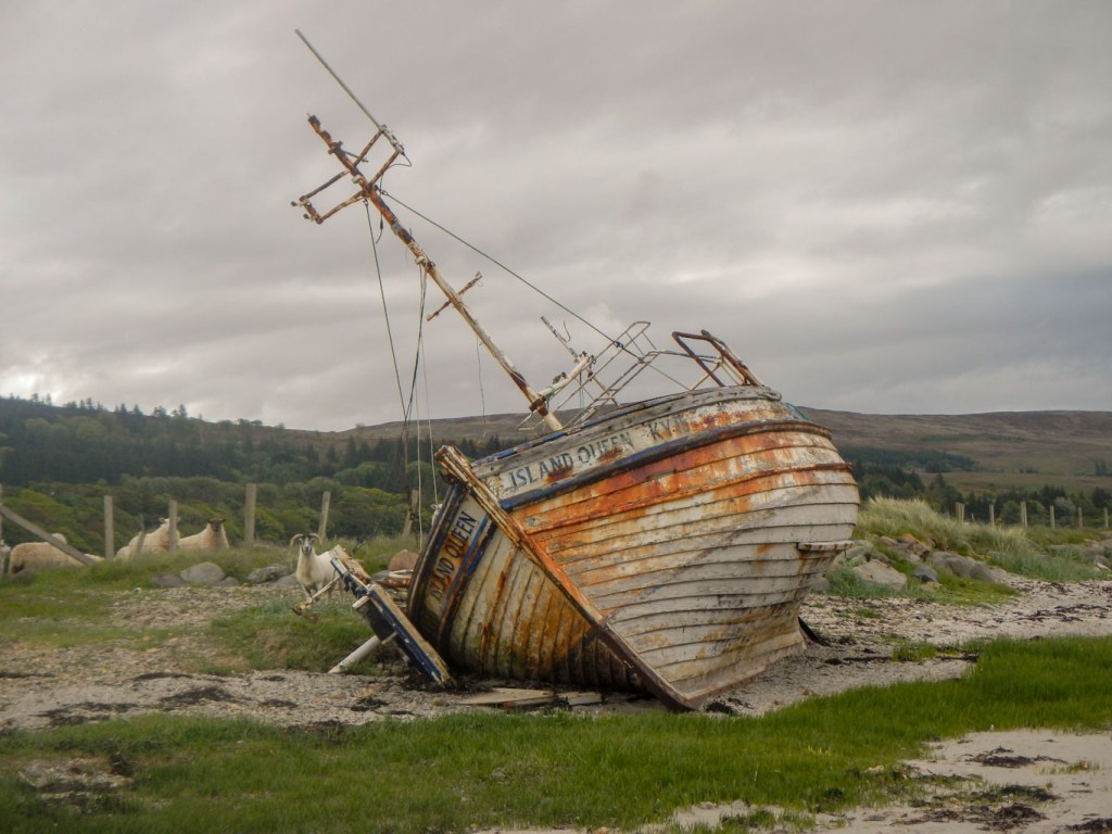 I was dropped off next morning at the same spot – the difference was that the weather was dry. The walk started by following the road on a pavement. Eventually I left the road, passing through the grounds of the Ronachan Estate. The path was very close to the road as it followed the rocky shoreline, sometimes descending to the beach. I didn’t see any otters but there were plenty of oystercatchers. The path deviated from the main road to go round the sandy Rhunahaorine Point. In order to go round a holiday park, the route continued on a sandy beach where I saw the shipwrecked remains of “Island Queen” and also spotted the ferry sailing across from Gigha.
