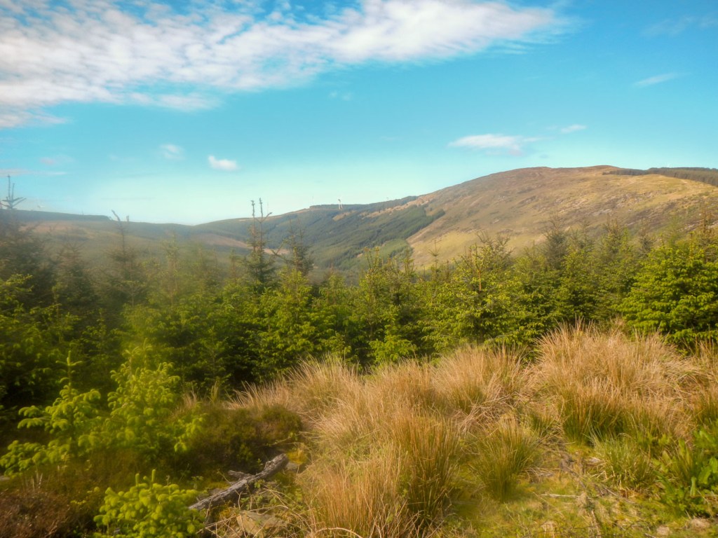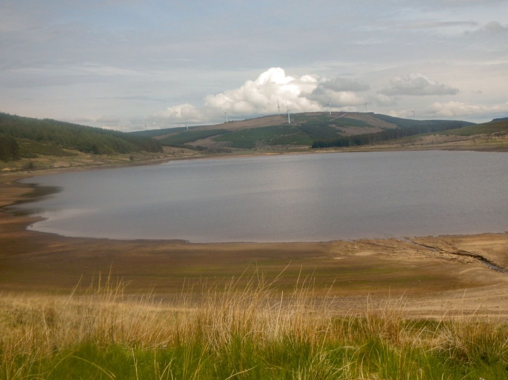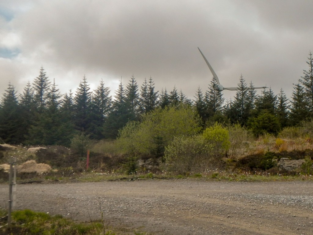 After this more tricky scramble, the route crossed the B842 again and passed through the Torrisdale Castle Estate (“Gintyre Way”). I spotted some soaring eagles – possibly sea eagles, avoided the temptation of the café and was soon through the estate grounds and on the open moor again. There were many wind turbines and I even walked through the construction area for phase 3 of Beinn an Tuirc windfarm. Like the previous day, it was an easy but undulating track walk so I made good progress, eventually descending past Lussa Loch. This is dammed and seemed very empty – it apparently provides flow regulation for Lussa power station. I heard cuckoos as I sat eating lunch overlooking the loch. I think I have heard cuckoos every day of the holiday – but not seen them as they keep well hidden.
