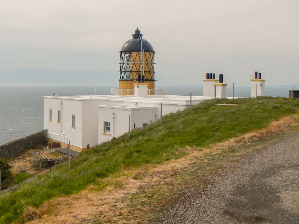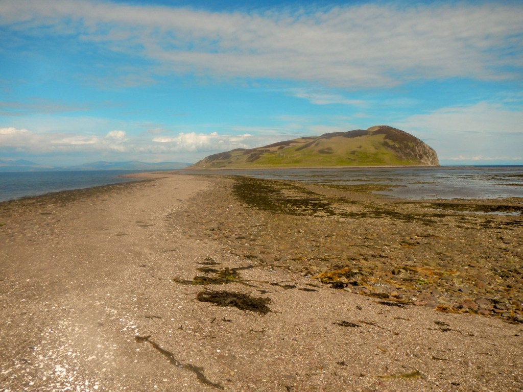 All was not lost. The walk across the causeway had been exhilarating. My husband returned the way we had come, but, having retraced steps to the causeway, I walked past some log cabins to the Stevenson lighthouse at the northernmost extremity. Then I turned and cut across to climb up a short but steep path to the trig point at the high point of the island. The views on this clear day were superb, including clearly seeing the entire dog legged tidal causeway to the mainland.