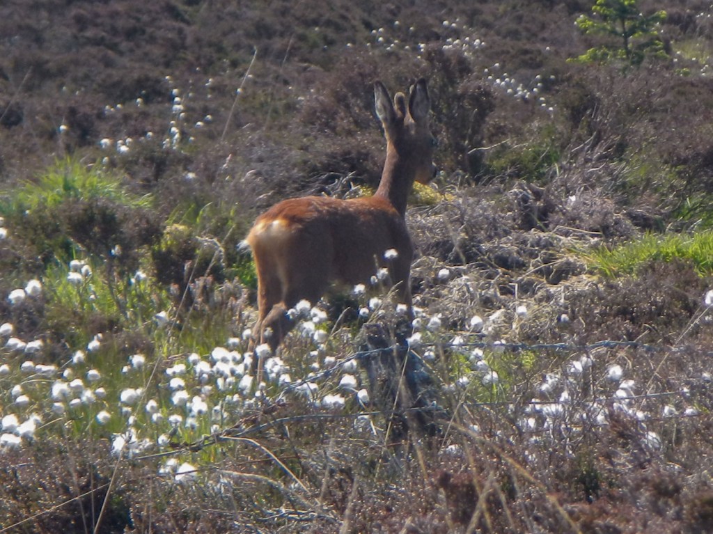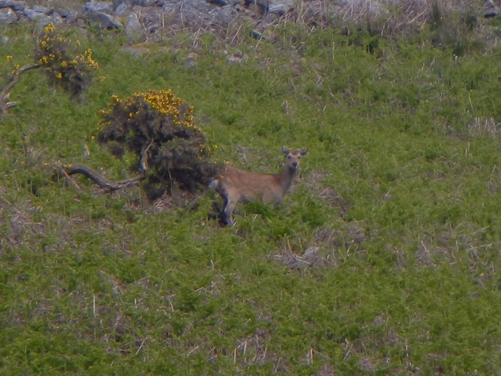 I walked past the quay and the prominent carved granite cross, past the Art Nouveau Cinema and out of town past the Davaar Causeway. I saw two people struggling to push a bike laden with buckets across the sand – no doubt gathering shellfish. There followed a long undulating road walk. However it was a very quiet road and full of interest – rocky shore line with multiple shags, soaring gannets, the seemingly ubiquitous oystercatchers but unfortunately no otters. There were fields with sheep, fields with cows and calves. The sun gradually appeared and it was turning into a gorgeous sunny day. There were a couple of steep hill climbs on the road and I saw cyclists testing their strength and stamina on these. I even saw deer who stopped long enough for me to take photos!