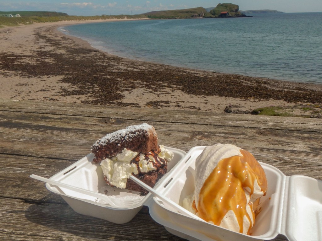 Soon this pleasant interlude along deserted beaches ended. Presumably there isn’t permission for the path to continue along the coastline towards Dunaverty Bay. I returned to the road to walk to Southend where my walk for the day was completed. I met my husband and enjoyed eating a generous segment of chocolate cake with cream served personally by Frances at Muneroy Restaurant and Stores. My husband enjoyed his SECOND cake of the day and he hadn’t even walked there. We also remembered to buy a half meringue for Tracey – Frances knew exactly what was required and this was clearly a regular request.