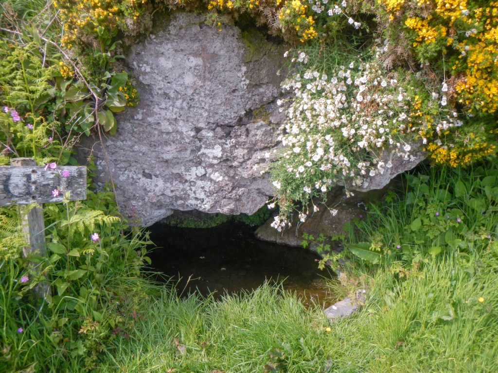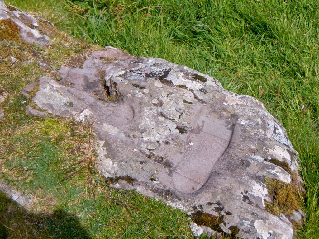 Having consumed our takeaway cakes and coffee, watching dive bombing gannets fishing over Dunaverty Bay, as we sat on a bench overlooking the bay, we continued on our way. We visited the ruined 13th century St Columba Chapel complete with further medieval carvings like the ones at Saddell Abbey and also an unusual gravestone topped by a carving of skull and crossbones. We looked at the well from which St Columba reputedly drank following his landing in 563 to bring Christianity to Scotland. There are even some footprints of Columba which we saw carved in the rock. I thought he had landed in Iona, having the previous week visited the landing point in Iona – clearly all is steeped in legend and a mix of fact and fiction. That said, I did think that the landing place in Iona was treacherously rocky and a likely site of shipwreck rather than a controlled landing! Next to this we visited the Keil caves, previously inhabited by people but now only by birds who I surprised (and they surprised me) as I entered one of the caves. On the rocks below there were seals basking. There is a lot to see here.
