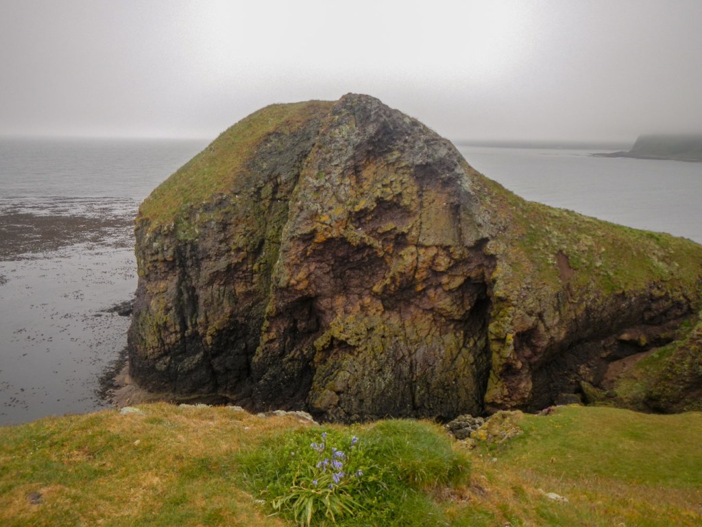I was looking forward to my final day, especially the walk over the cliffs around Binnean Fithich with what seemed to be the possibility of fine views. Sadly this was the day when the cloud was down and it rained nearly all day. I started from Southend, crossing the golf course to walk near the prominent hill fort site at Dunaverty. From here the walk crossed the bay that I had looked over the previous day while eating cake. Cattle on the beach were eating seaweed and I was relieved that they showed no interest in me. Unfortunately there followed a fair bit of road walking. My husband’s “pop up café” appeared at one point and I drank my coffee quickly while standing in the rain.