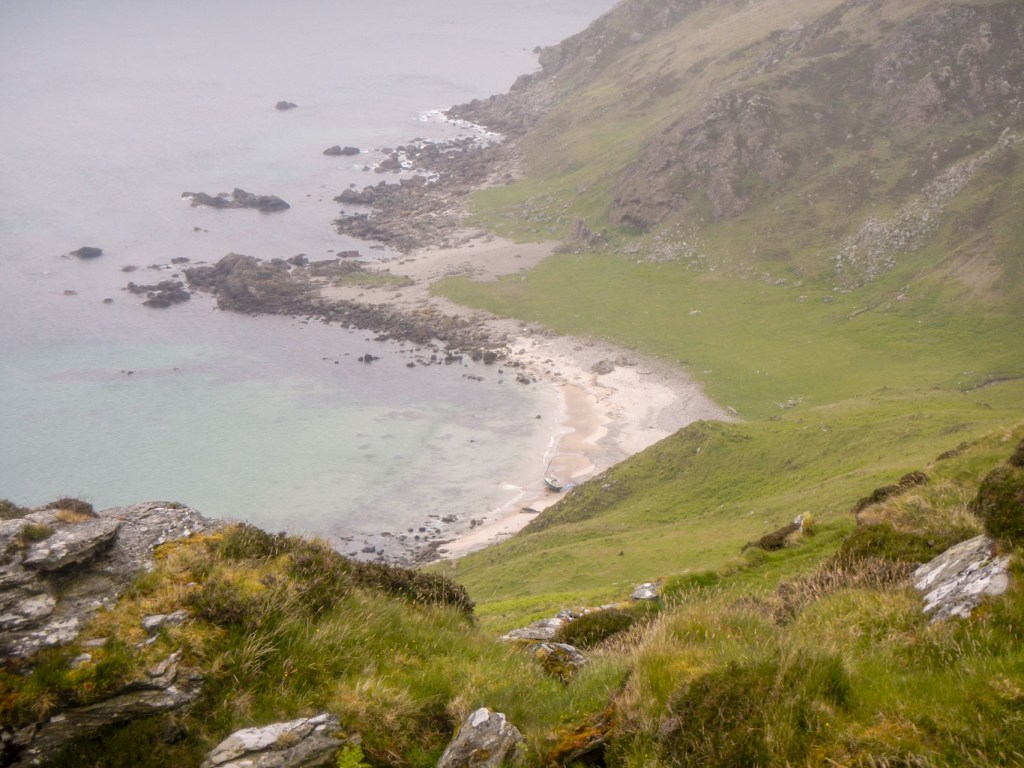 Soon after finishing my hasty lunch, the route turned off the track along an indistinct path. As I reached the high cliffs, I saw a large colony of wild goats that quickly ran off. This area is part of Largiebaan Wildlife Reserve. The mists, far from rolling in from the sea like the song, were actually blowing out over the sea. I was anxious not to be near the cliff edge in this windy, wet weather with poor visibility. I missed the “path” and turned too far inland, climbing higher than necessary up the hill. However I managed to navigate back on to the path and follow the marker posts as I descended below the cloud level. Eventually there were some views of the beach at Innean, but I wasn’t tempted to descend to the sailor’s grave and the beach given the poor weather.