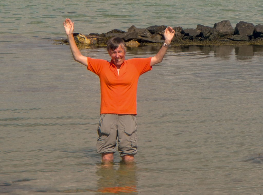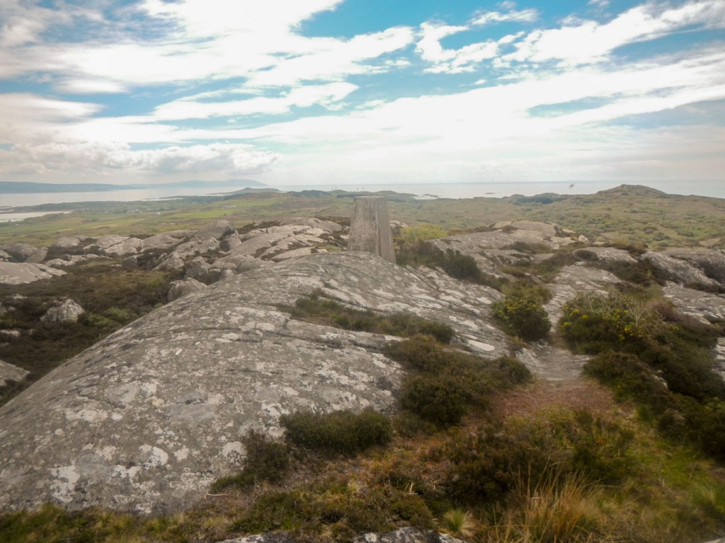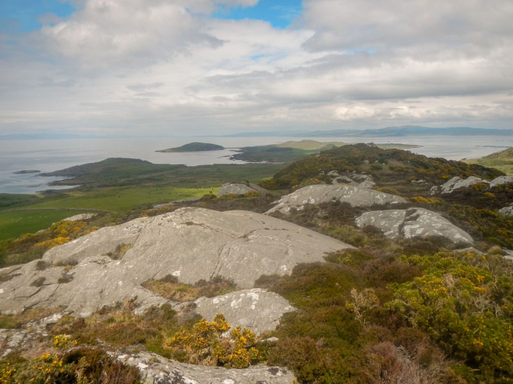 We were looking forward to “Side Adventure 3” which was a day trip to Gigha, travelling across the Sound of Gigha on the Calmac ferry – Loch Ranza. After crossing, we walked up to the north end of the island, visiting the northerly point with excellent views including of the Paps of Jura, making the ascent the hillock of Cnoc nan Gobhar again with glorious views and finally eating our lunch sitting on the beach of the more northerly of the beaches flanking the spit. I looked at heading up to the summit of Eilean Garbh on the far side, but there was an awkward looking steep step up the cliff and I decided against it. However as we returned south towards the village, I did take the turn to climb Creag Bhan, at 101m the highest point of Gigha. Unlike the previous day, it was clear and sunny so it was delightful spot, with a trig point and a view indicator crowning the topmost rocks. The wide ranging views encompassed Jura, Islay, Kintyre, Mull and even Northern Ireland as well as almost the whole of Gigha – and the arrows on the panorama showed me what was in each direction. This for me was the best part of my visit to Gigha. However before we departed on the ferry there was time to visit a small beach at the south end of the village for a quick paddle in the remarkably warm sea, a fitting conclusion to my Kintyre Adventures.