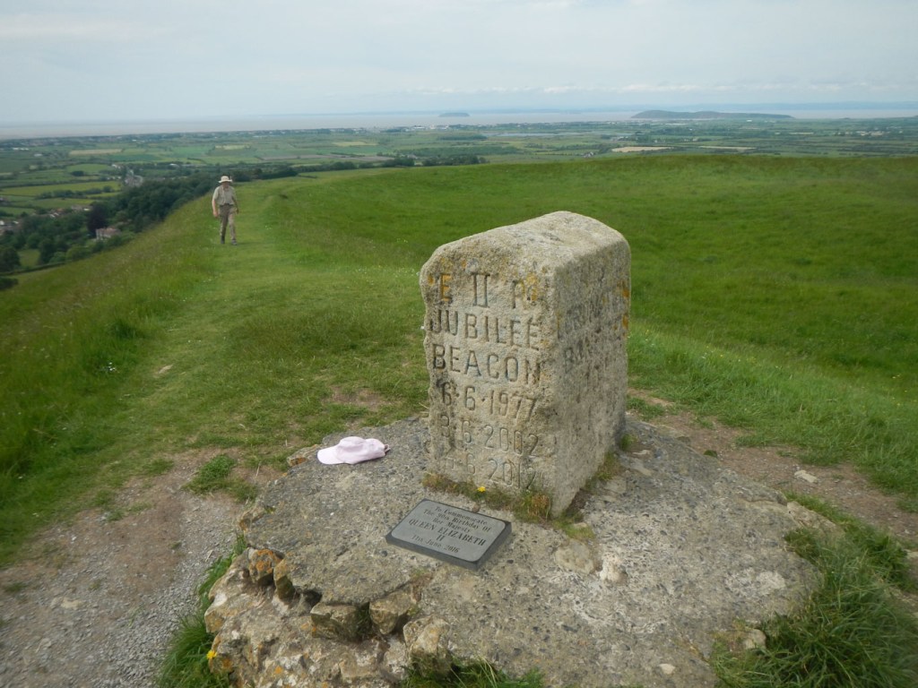 Once at the top, it becomes clear that this is an old hillfort and in an appropriate strategic position. The notice in the car park had also explained that it was an ancient religious site. There is a depression in the centre and a raised “path” all around the perimeter of the summit area. A large stone commemorates significant royal jubilees and birthdays both of Queen Victoria and of the current Queen Elizabeth. There is also a viewpoint marker further round the perimeter. On this clear day the views were far ranging and magnificent. It felt that we were far from the bustling motorway which we could see below us. The knoll is only 139m high but, because it is surrounded by much lower land all around, it is more impressive than many much larger hills.