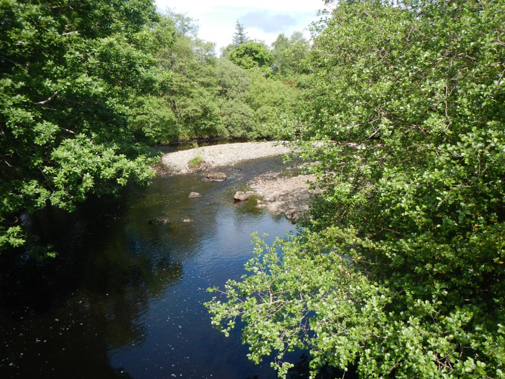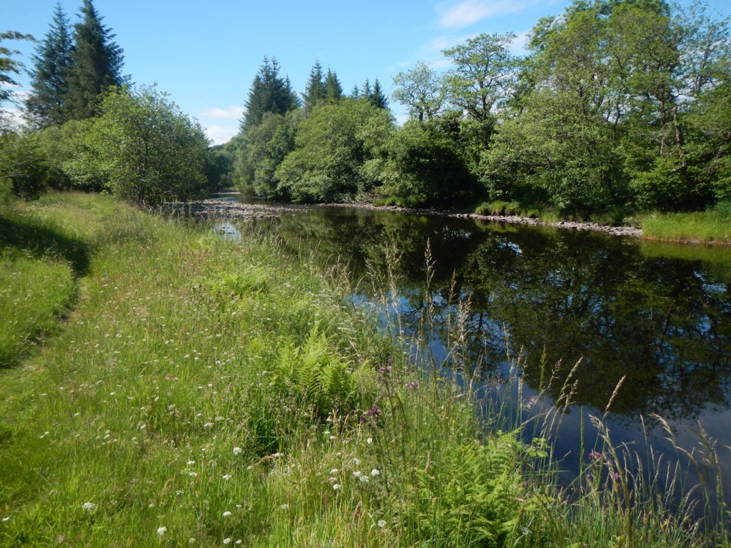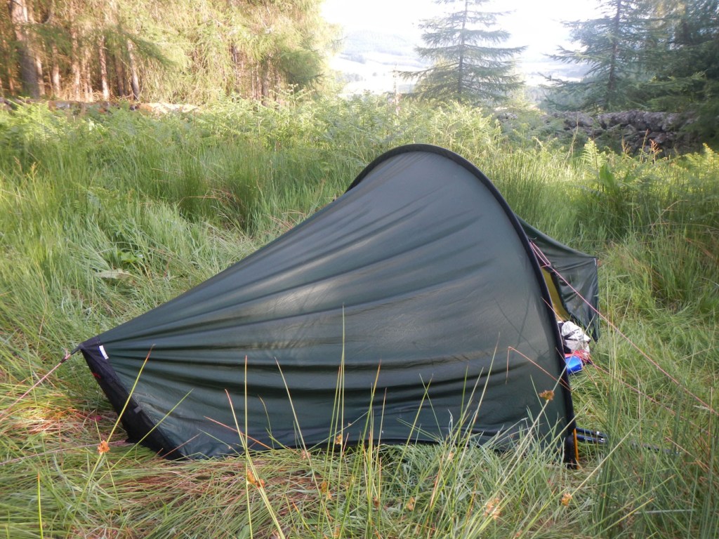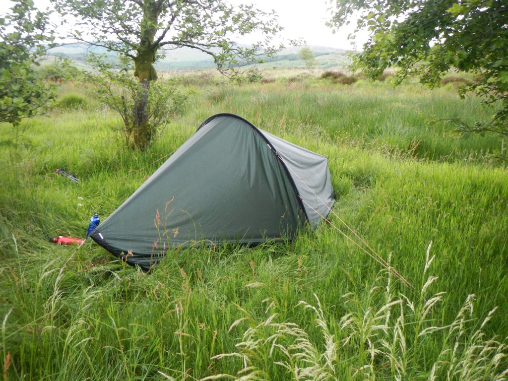 Finding a place to camp in the woods above the River Cree was difficult. I was fortunate to find, after a long day, a reasonably flat spot sufficiently clear of vegetation just beyond the old wall where the path turned away from the river.