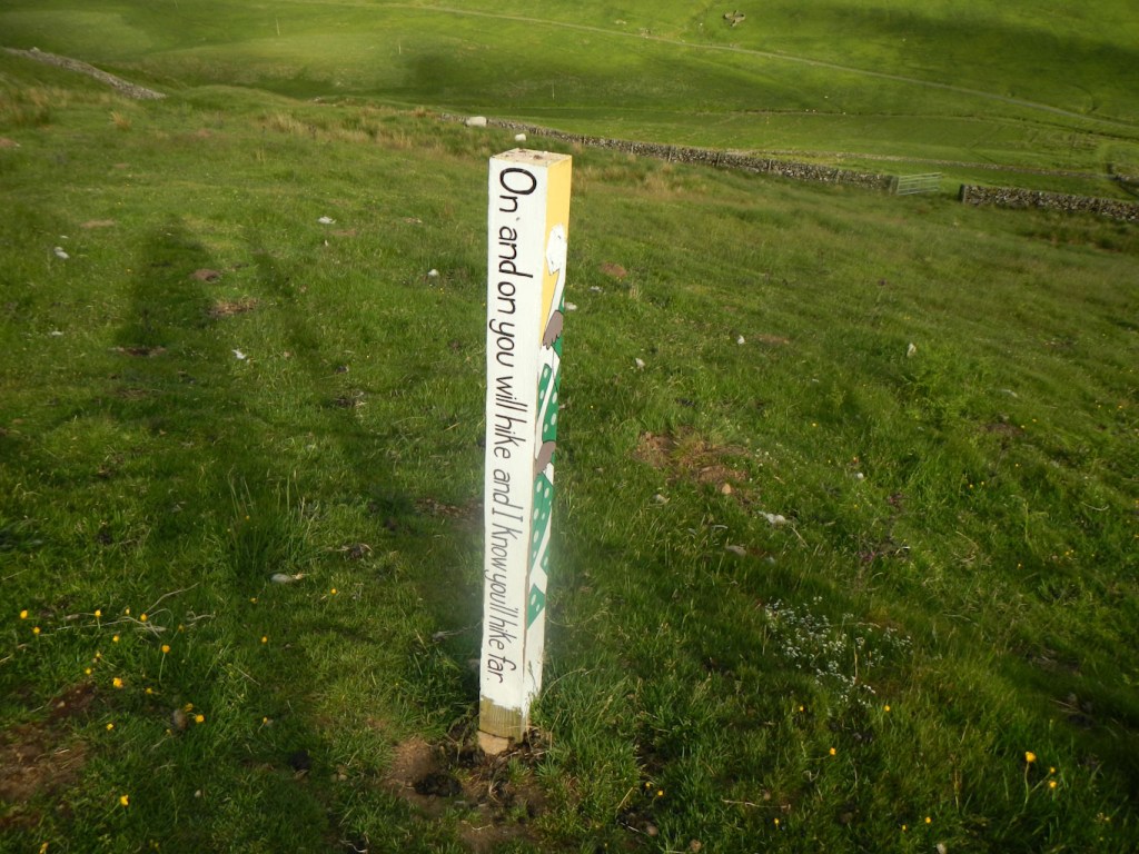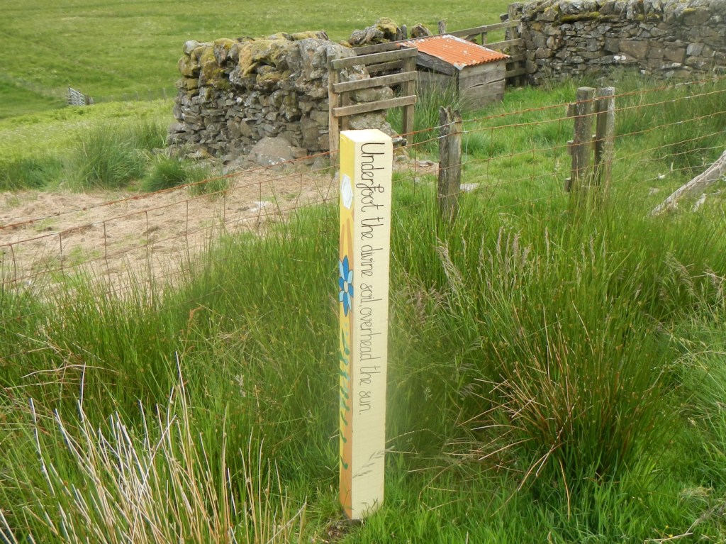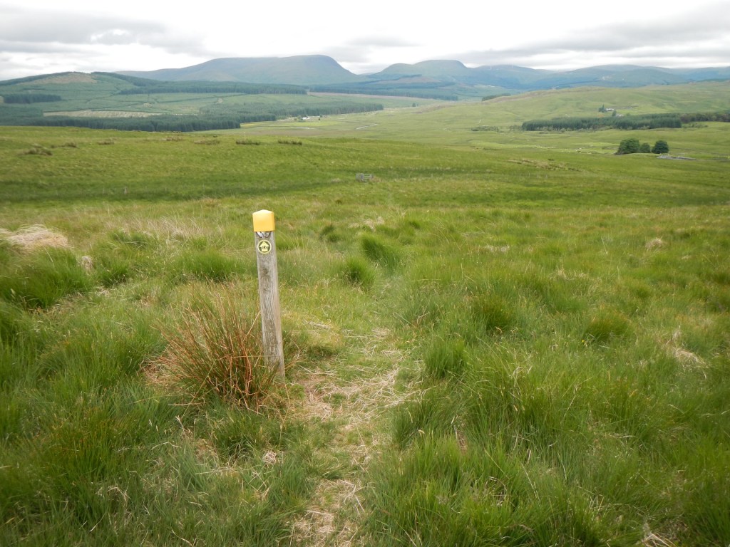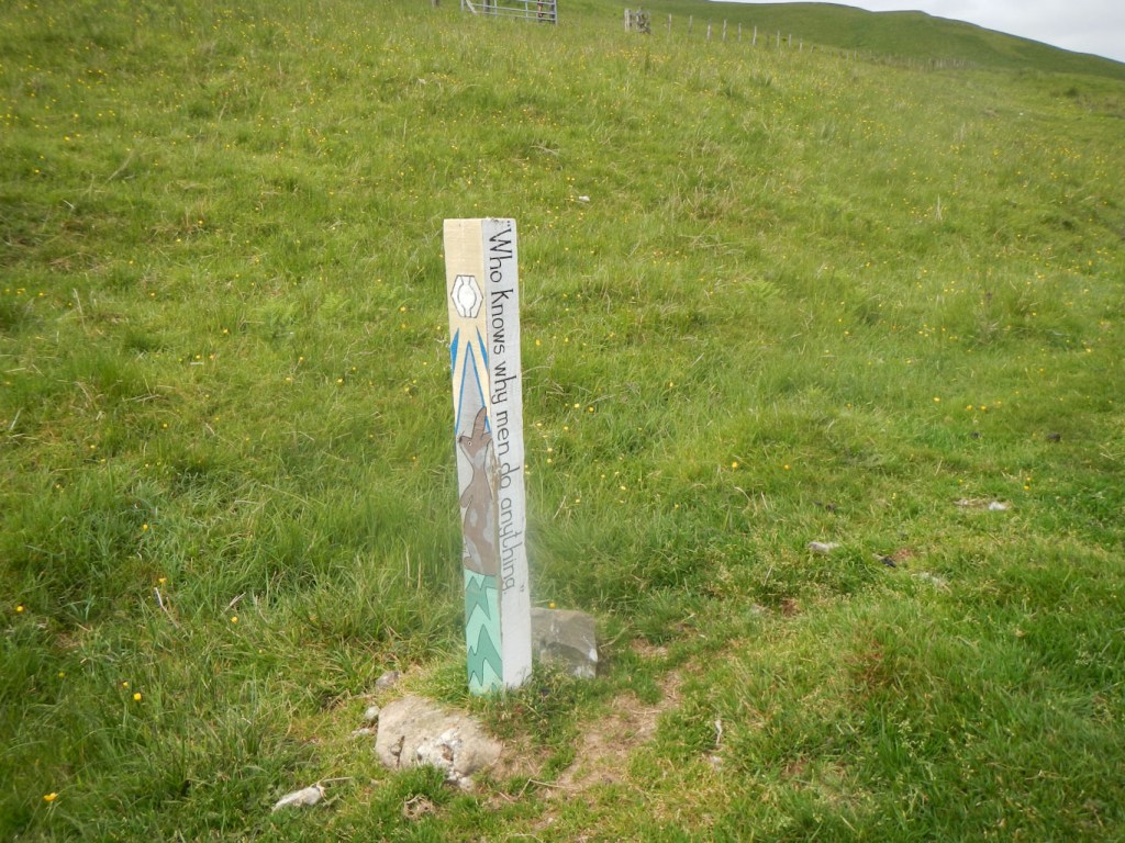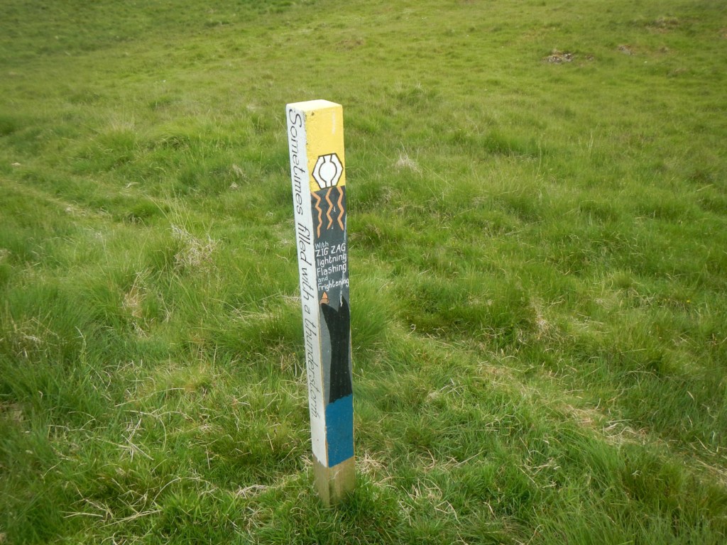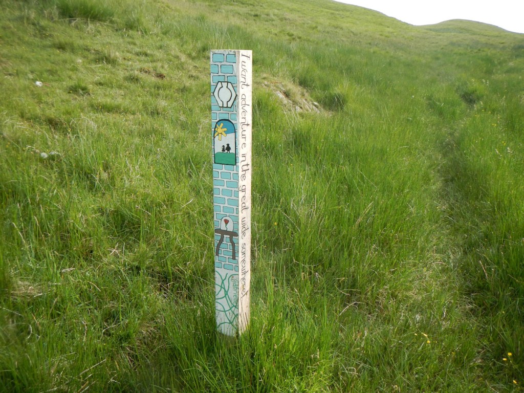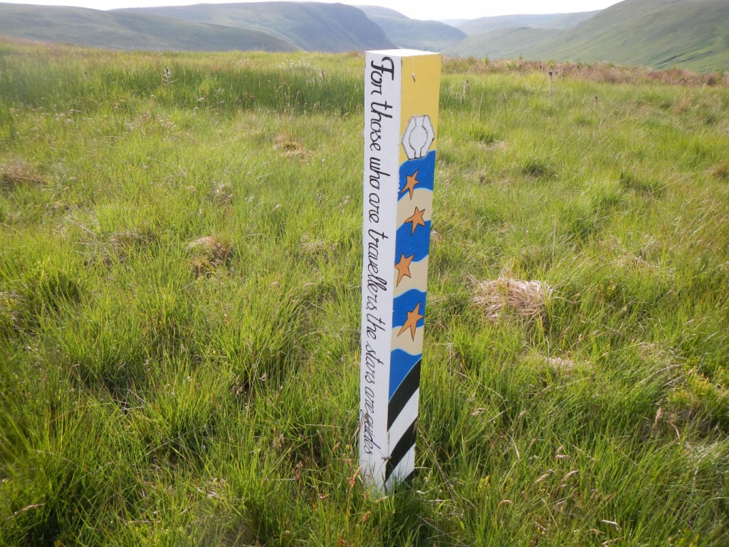 I reached the Polskeoch Bothy but knew I had a long walk planned the next day so walked on past Polskeoch Farm and Polgown, finding a superb camping place high above Polskeoch Burn, close to one of its tributaries. A notable feature here and in the next few kilometres was that the frequent way marker posts had been very professionally decorated seemingly by local primary schoolchildren no doubt helped by their teacher. The pictures and words certainly boosted my morale.