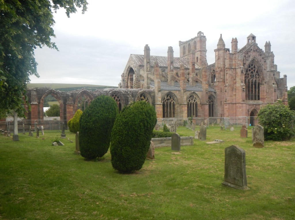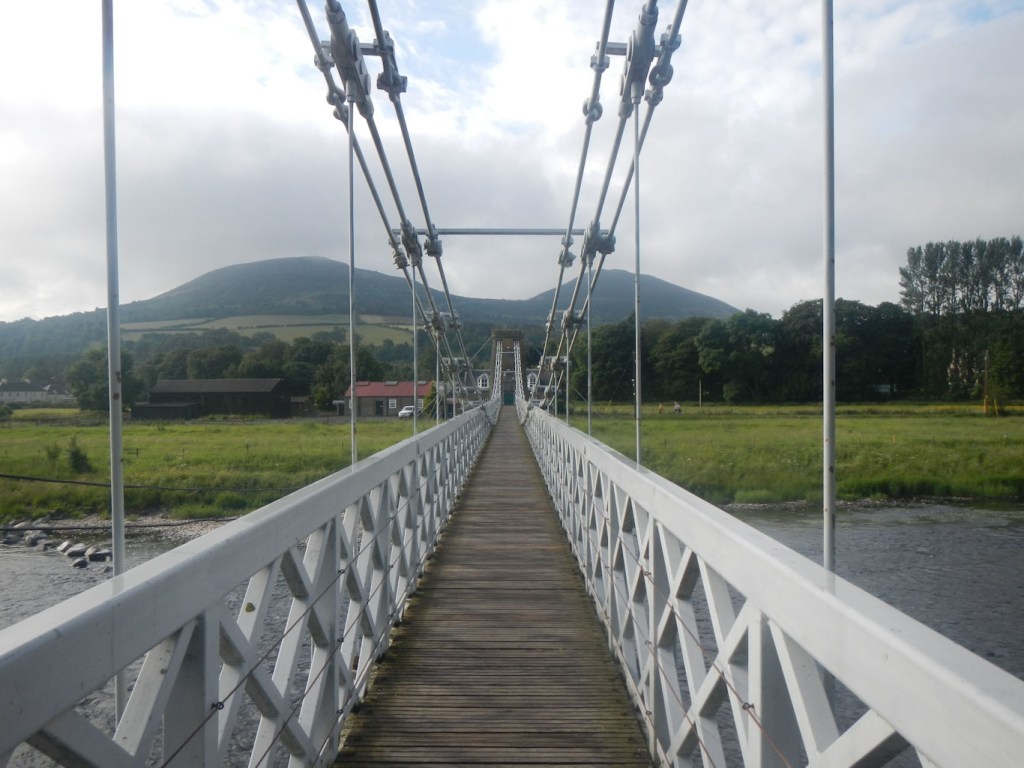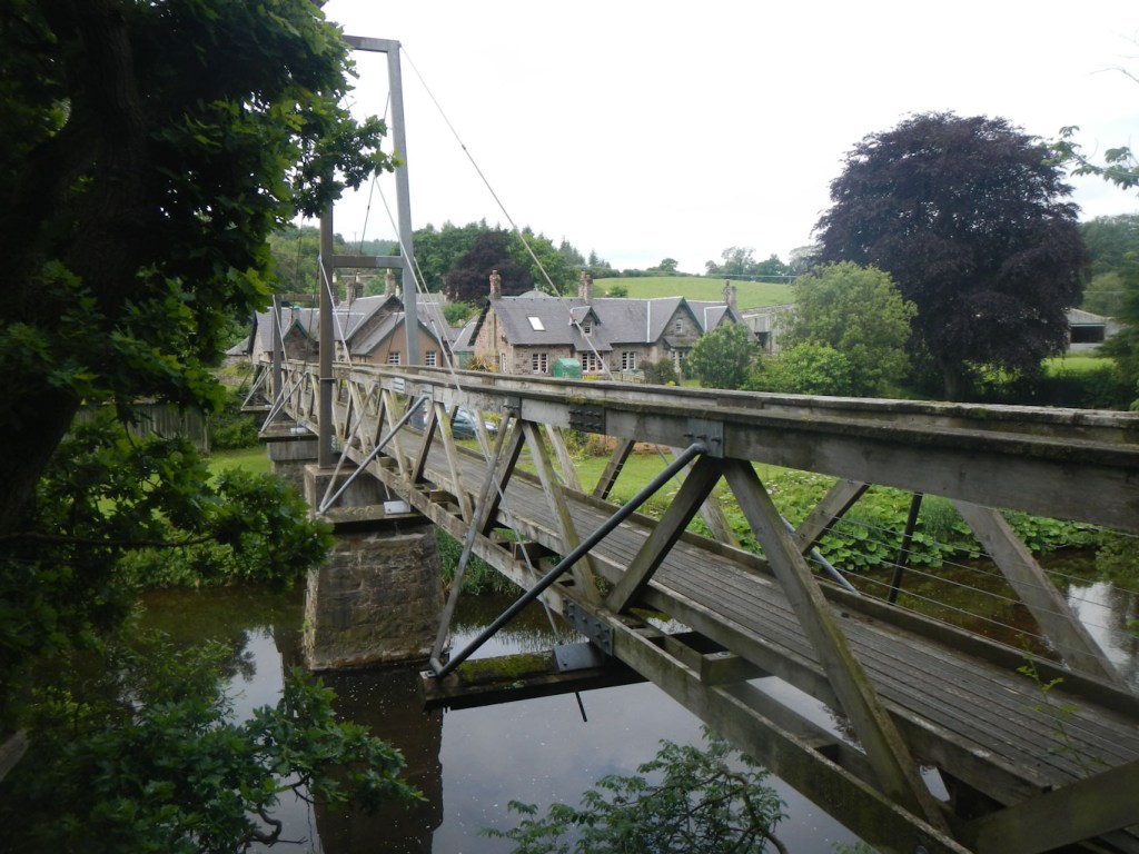 Having descended to the River Tweed, the weather seemed to get hotter and hotter – not that we should complain. Unfortunately I managed to miss a turning in Galashiels but was able to regain the route without backtracking. I’m not sure that it’s a good idea to have to walk past the sewage farm particularly on such a hot day (this was after I was back on the proper route). However in the end I arrived at Melrose where it was so hot that people were swimming in the river. I stayed in a hotel. After a rest and a lovely dinner at a nearby Italian restaurant, I had gained sufficient energy to wander round the town looking at the Abbey and the spectacular old chain footbridge over the Tweed, which I would be crossing the next day before following the line of Dere Street (an old Roman road most of the way to Lauder.