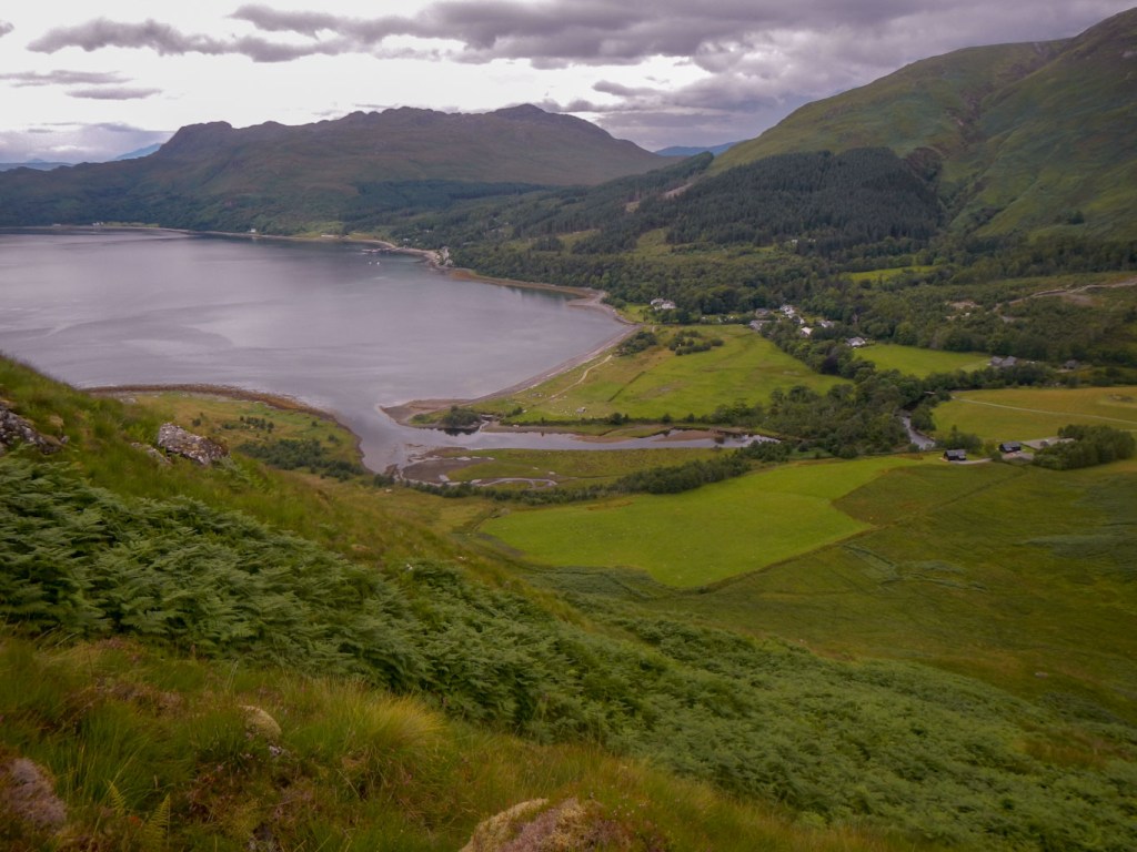 I discovered the proper ridge path further down – I had missed this on the way up. There were excellent views towards Arnisdale on the very north of Loch Hourne. It was a stony path with some steep steps.