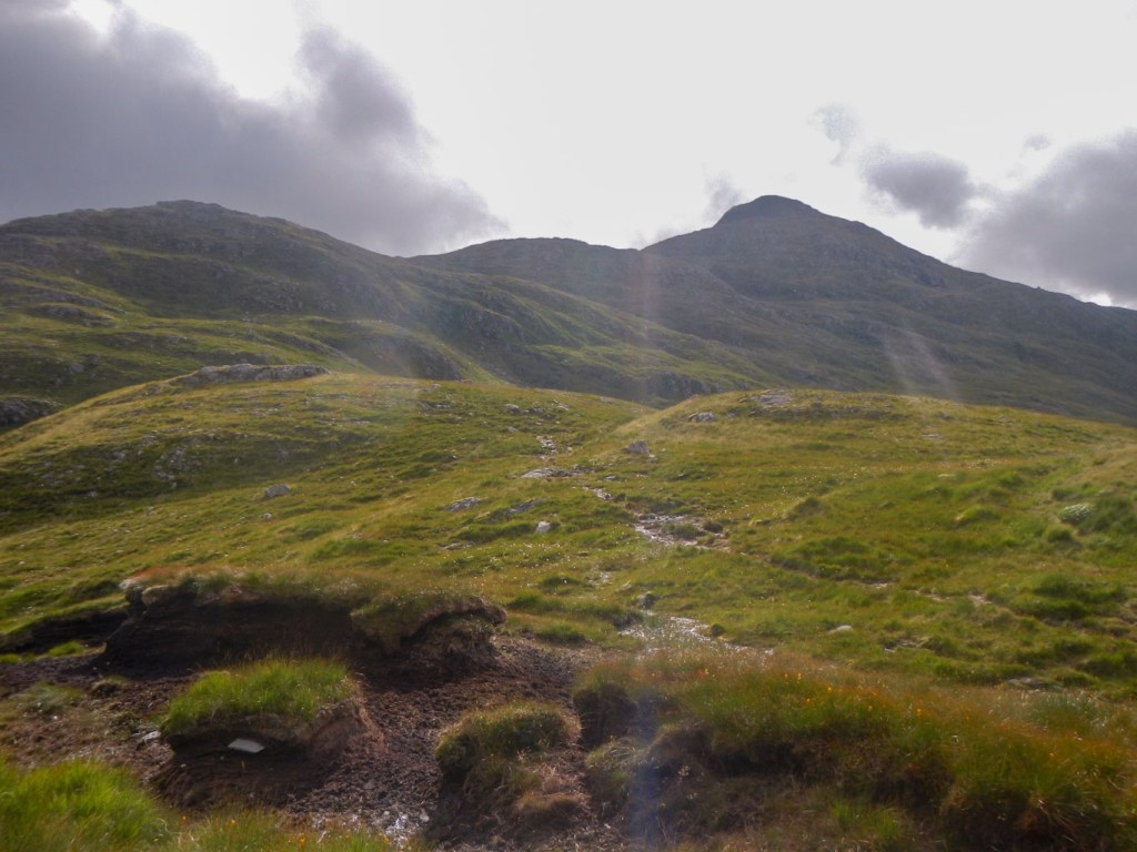 I left the main path to Barisdale near its highpoint. There seemed to be a path in roughly the right direction, although all the route descriptions stated that there was no path. Unfortunately it led me slightly astray so I ended up ascending a steep grassy bank to end up just below the final ridge.