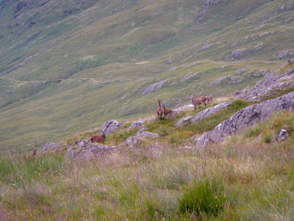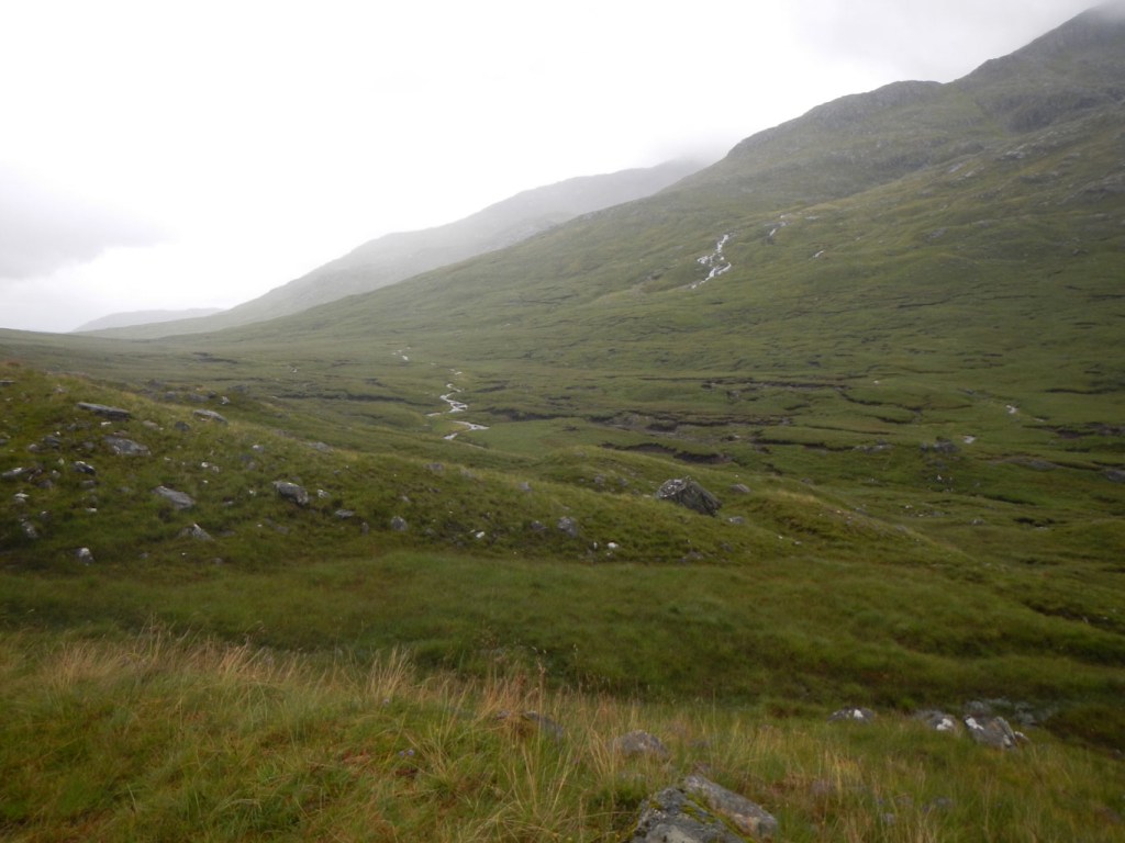 Eventually the rocky path fizzled out to nothing and I headed downhill in a more westerly direction, surprising a group of deer. As I was reaching a place where I could just about see the main path in the glen, the heavens opened, rain poured down and the visibility decreased. I lost the path and ended up meeting it below the high point.