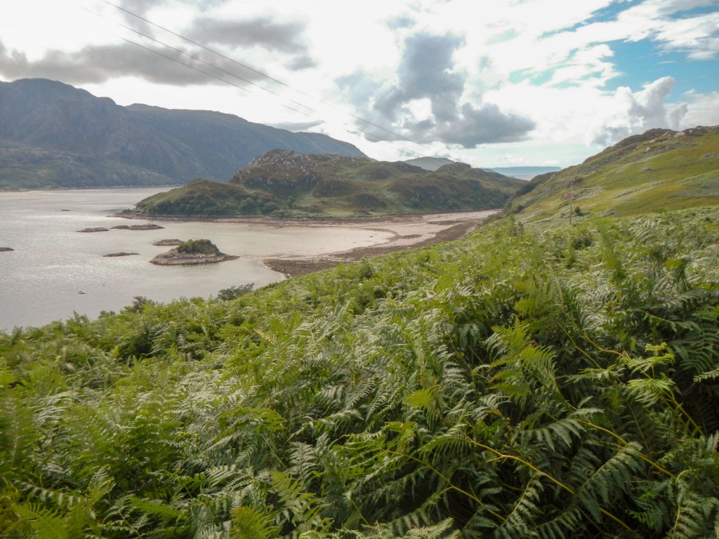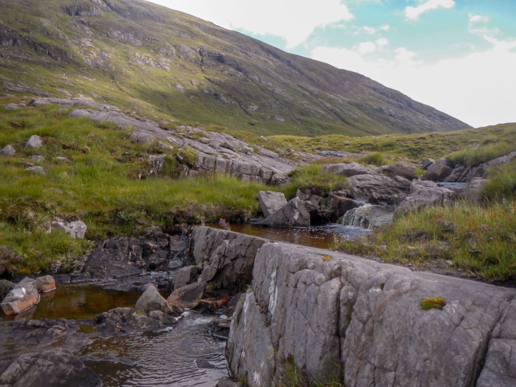 Eventually I arrived at the end of the road (Airor). from there I followed a footpath to Inverguseran Farm, bravely (for me) passing some Highland Cattle. Skye seemed to be very close across the water. I had to ford the Abhainn Inbhir Ghuiserein. I should have taken off my socks and taken the insoles out of my boots so they didn’t get wet but I thought I might get away with it – definitely a mistake, especially as I had taken off my gaiters too on the long road walk and not put them back on.