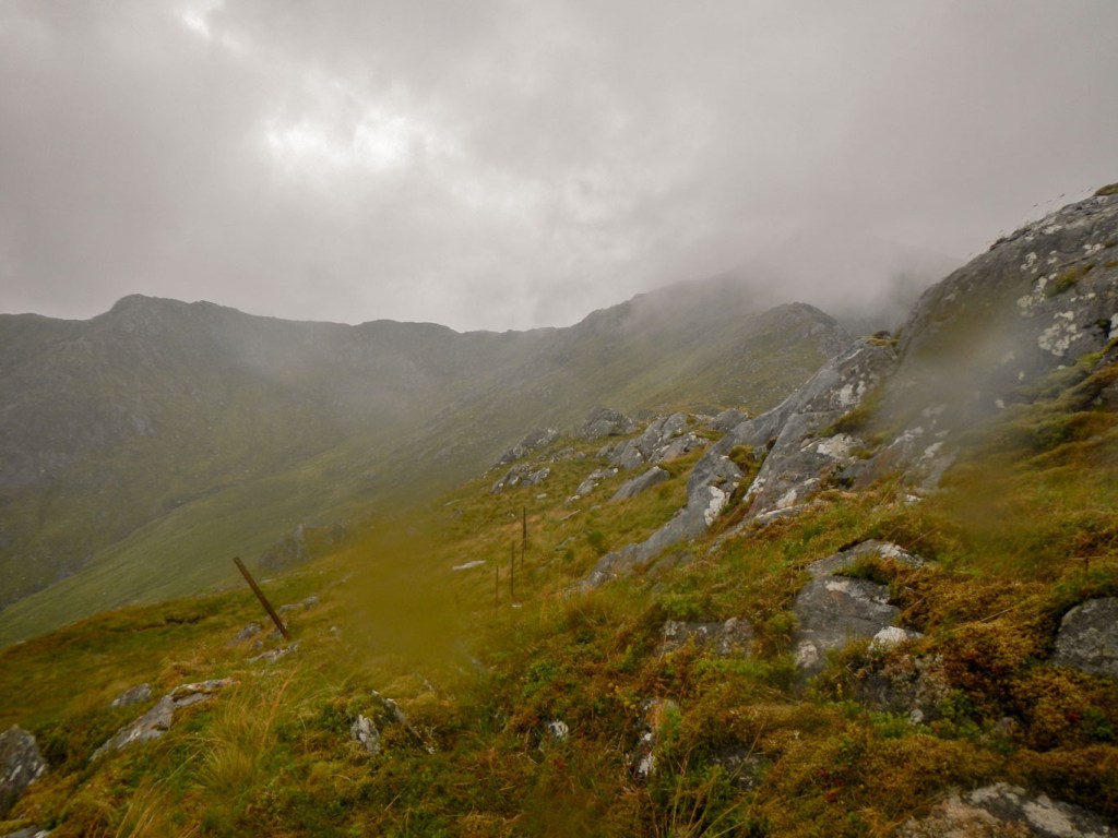 It was a scenic path and I was enjoying the climb even though it started to rain. By the time I reached the fence posts guiding me towards the final ridge it was raining a lot and very windy. I had ascended from the road at about 130m to around 700m but the summit was still almost 200m higher at 894m. Sadly the weather was deteriorating and given that there was rain, wind and cloud, I had to make the decision to retreat. Otherwise I risked being blown off the ridge.