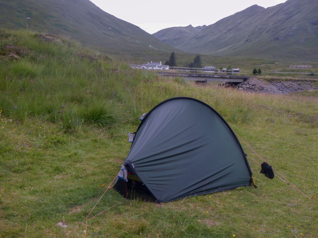 I decided to find a site to camp and shelter in my tent out of the way of midges (and potential rain) and then perhaps take my tent down (so it wouldn’t get stolen) to go for dinner . However having found a good flat pitch away from the road and main path, it started raining. In the end due to weather conditions I settled for my rehydrated bag meal at my tent. Well I had carried it from Glenfinnan and it made little sense to carry it home.