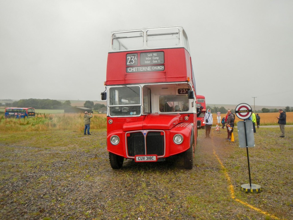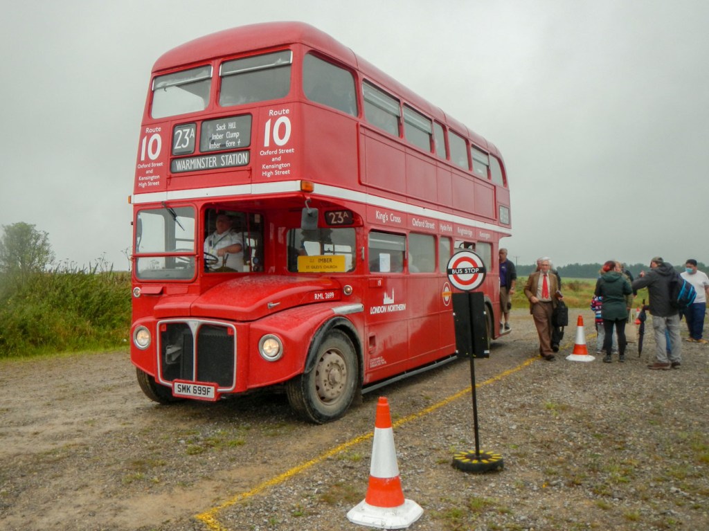 I arrived at Warminster Station on a packed train just after 10am. It seemed as if everybody piling off the train was going to Imber. Within seconds I had an Imberbus event guide in my hand and I’d bought my £10 all day rover ticket. There were several double decker red London buses parked near the station including an open top bus. Unfortunately it was pouring with rain but that didn’t seem to be putting anyone off. I pulled on my waterproof jacket and trousers and fitted the rain cover over my rucksack while I was waiting at the bus stop.