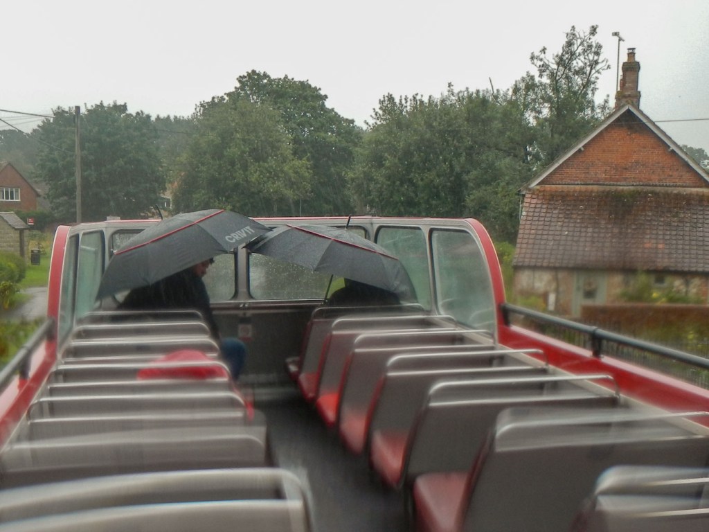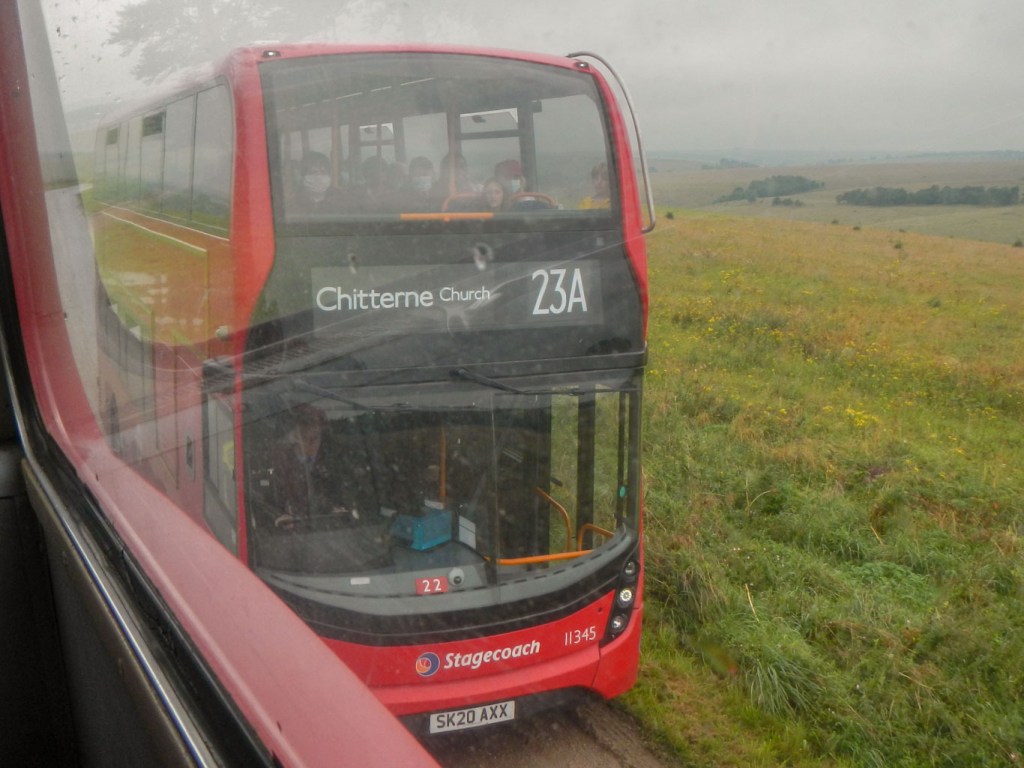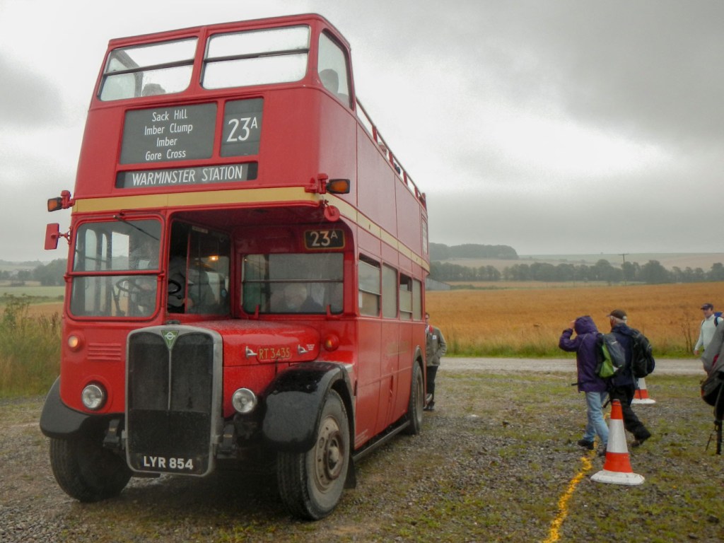 We headed for Tilshead, passing under some overhanging trees. Each time this happened our heads got soaked; on one occasion a branch came right down and was actually scraping over the seats! At Tilshead there were refreshments available, but I stayed on until Chitterne, where I finally disembarked to try to get on a warmer bus! There was a choice of buses and I travelled back to Gore Cross on the top deck of a closed top bus – this bus was busier.