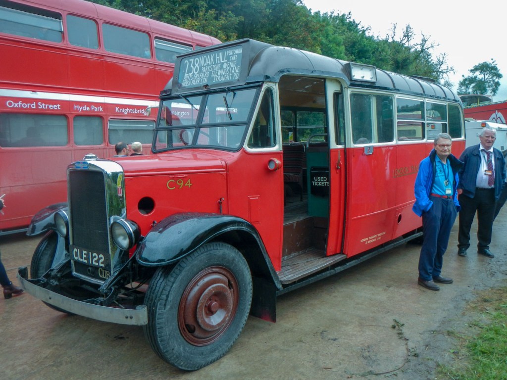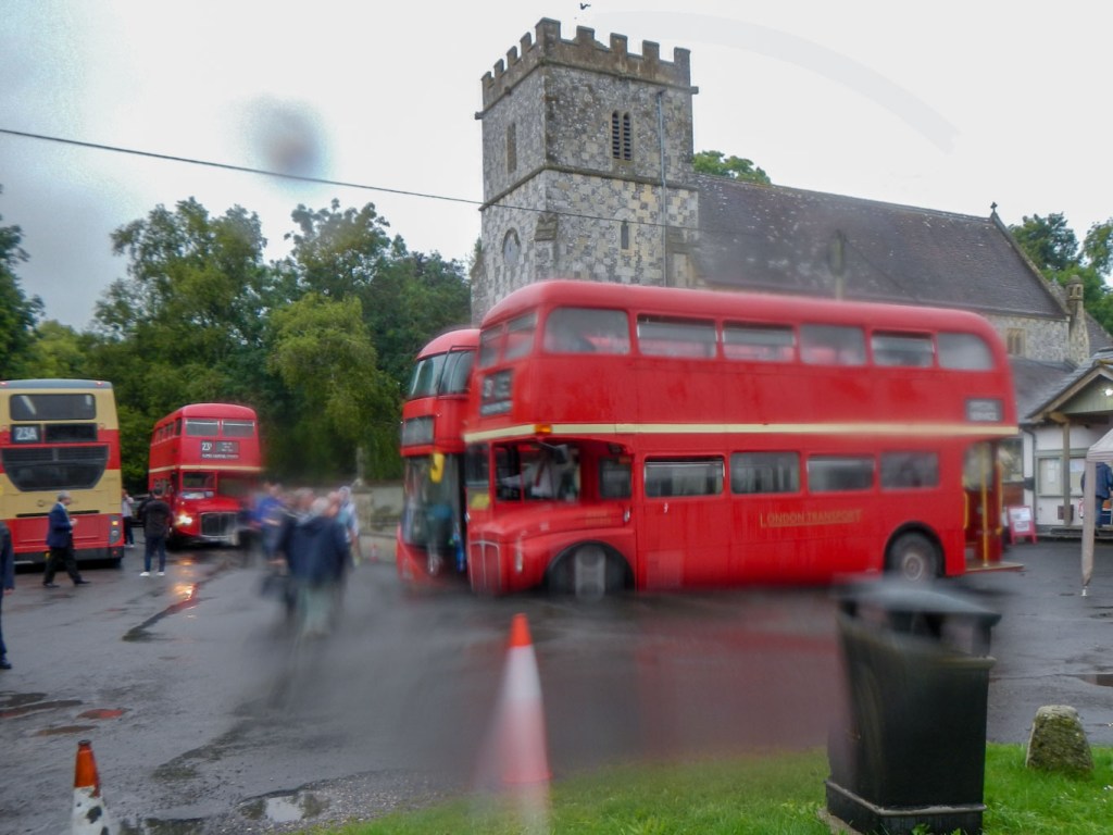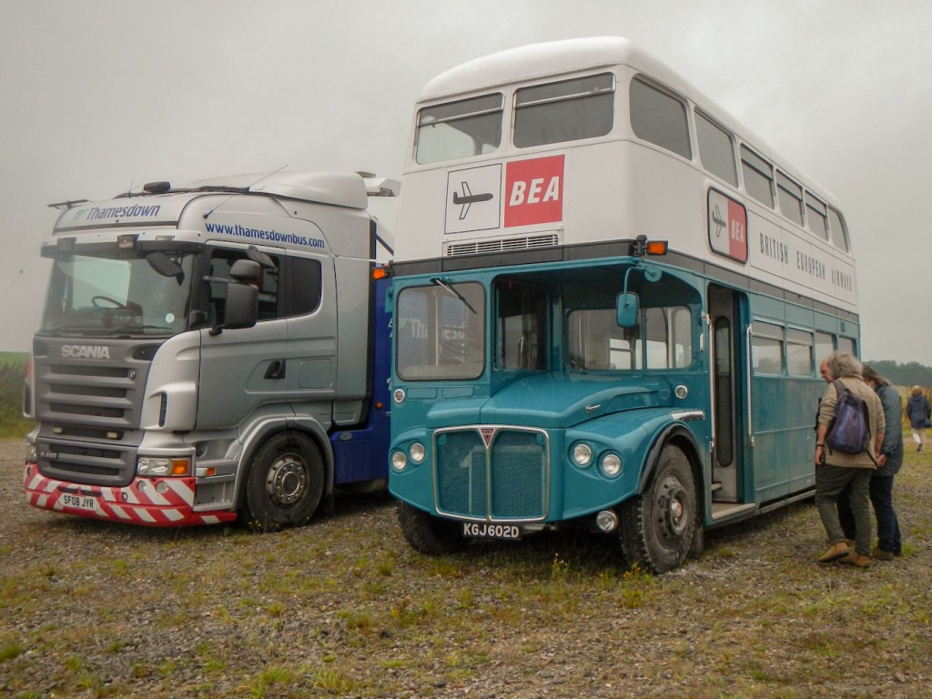 Soon I was on my way again. There seemed to be buses going past all the time and never long to wait for a bus. This time I got on the top deck of a 1950s open top Routemaster. There were only five of us on the upper open deck, which wasn’t surprising as it was pouring with rain. We travelled on roads which were at times little more than tracks, to get to Gore Cross. Here there was a breakdown truck at the ready and another vintage bus but this one was painted in a blue and white livery having been used by British European Airways. Apparently it was a spare bus in case one broke down.