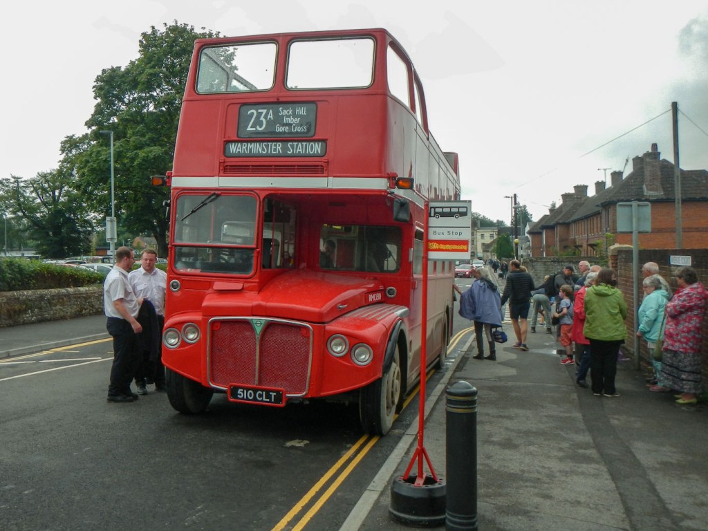 Next I went there and back to New Zealand Farm Camp on a different open top bus and then on another closed top bus to Brazen Bottom and the Lavingtons. Now I had travelled on every route. I spotted a Routemaster painted green – I think that’s London country colours and would have caught that for the ride wherever it was going, but I missed it. I ended up catching a bus to Imber village, where there was a single decker bus that looked very old. It wasn’t part of the service though and was just on the site for enthusiasts to look at. I caught another bus up to Gore Cross again then a more modern bus back to Imber village. After that I caught my final bus of the day back to Warminster. The immaculately clean buses of the early morning were now plastered with a fine layer of mud. Reluctantly I had to leave the bus day to allow time walk to Westbury on part of the perimeter path. I had booked accommodation there when everywhere I tried in Warminster was fully booked and it gave me a head start on my walk the following day.
